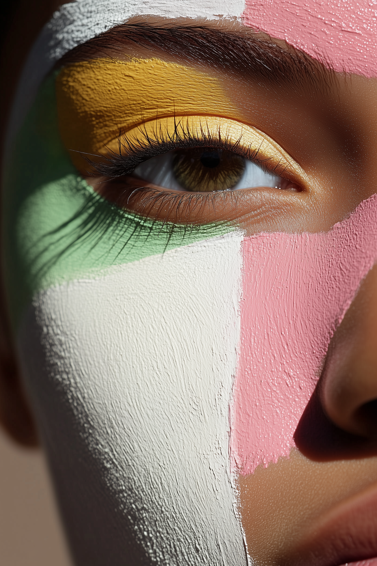 Close-up of a face with colorful geometric paint around a brown eye, featuring yellow, green, white, and pink hues.