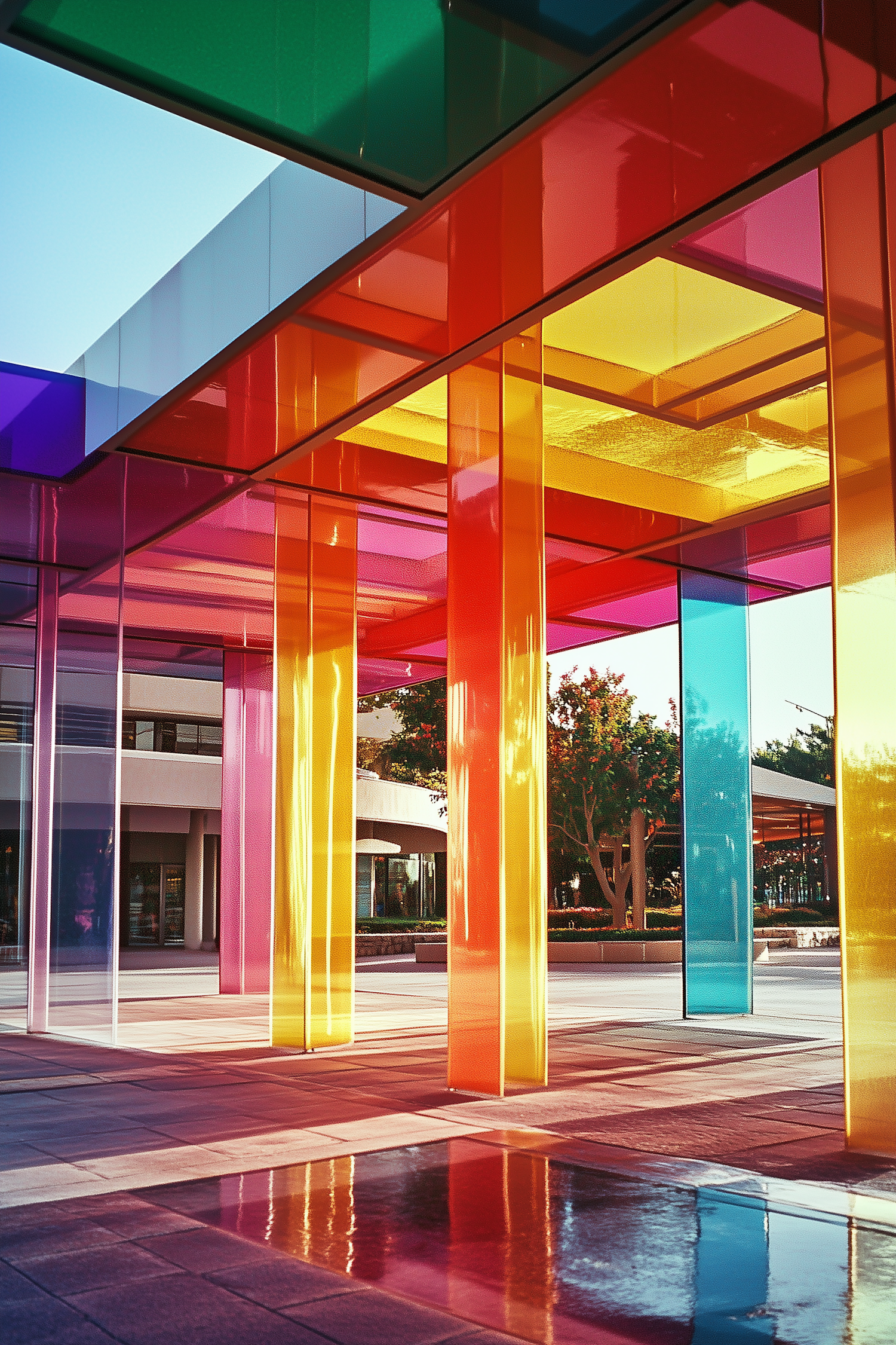 Colorful translucent panels create a vibrant architectural display, casting vivid reflections in a modern urban setting.