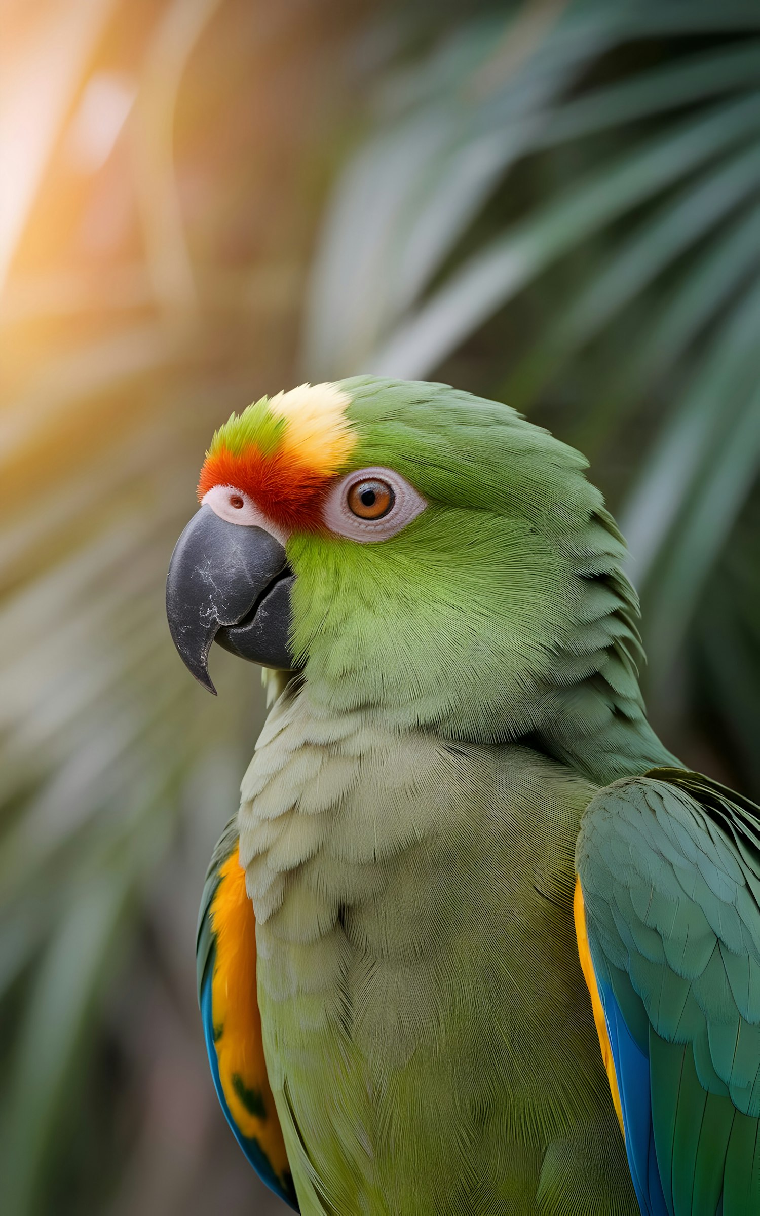 Close-up of a colorful green parrot with orange and yellow accents, perched against a blurred palm leaf background in warm sunlight.