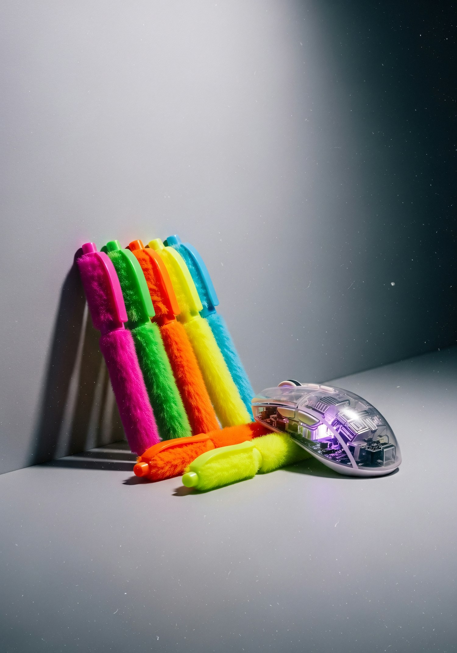 Brightly colored fuzzy pens and a transparent computer mouse with purple lighting on a neutral gray background.