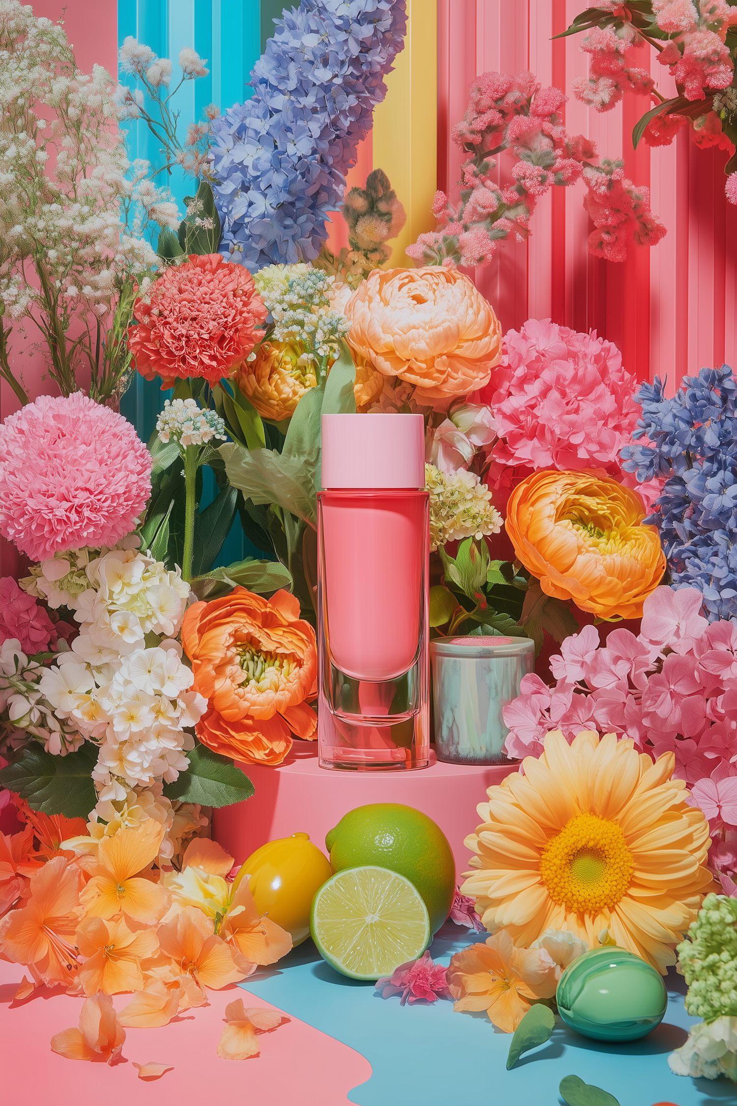 Bright floral and citrus arrangement with a pink perfume bottle, colorful flowers, and fresh fruits on a vibrant striped background.