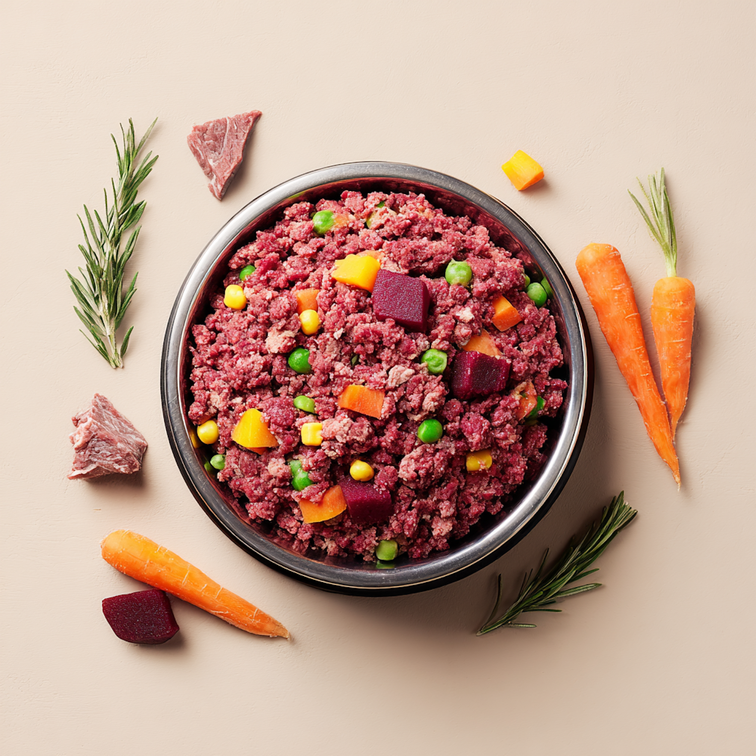 A bowl of fresh pet food with minced meat and colorful vegetables, surrounded by raw ingredients like carrots and rosemary.
