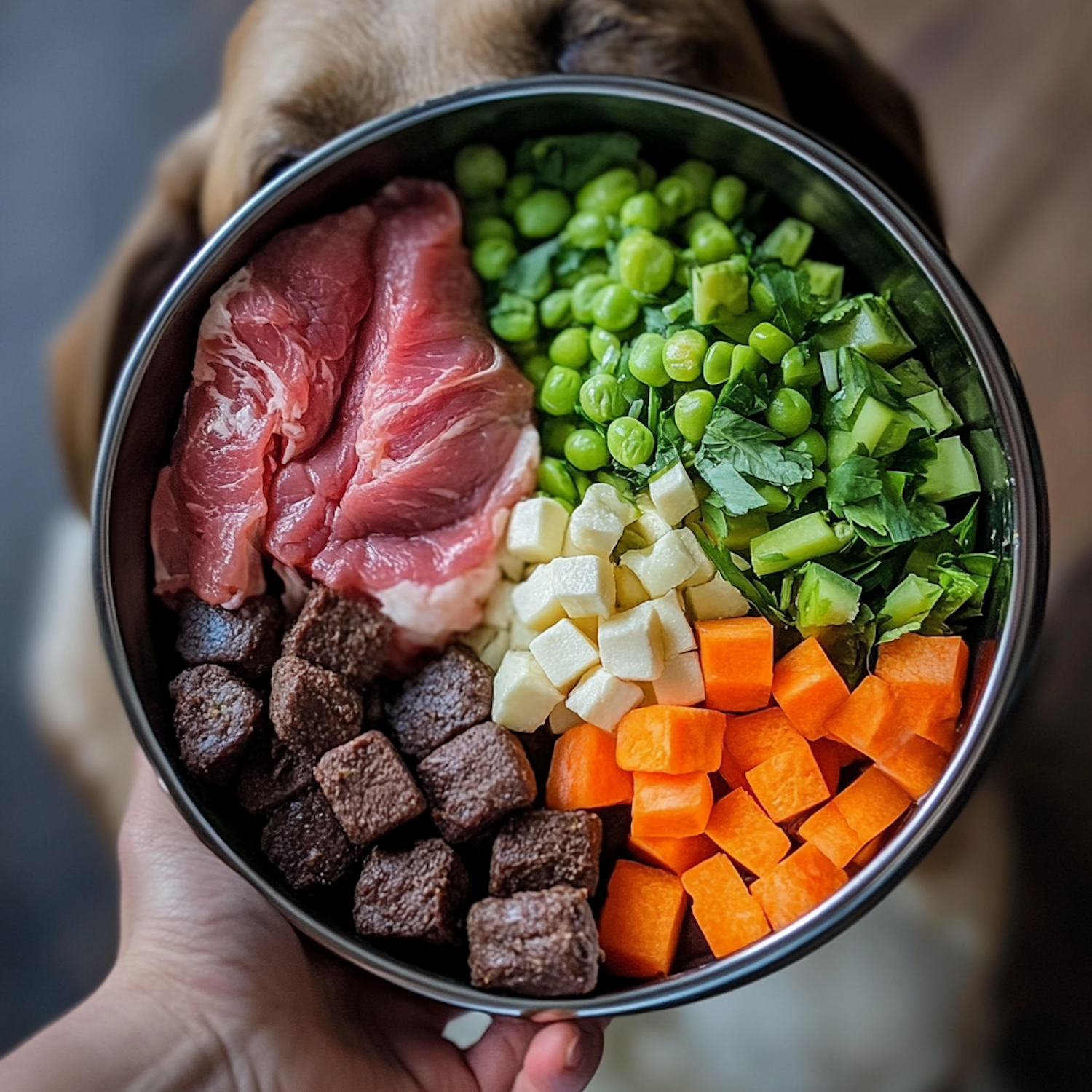 A bowl of fresh dog food with raw meat, peas, carrots, and kibble, held by a hand with a dog eagerly looking on.