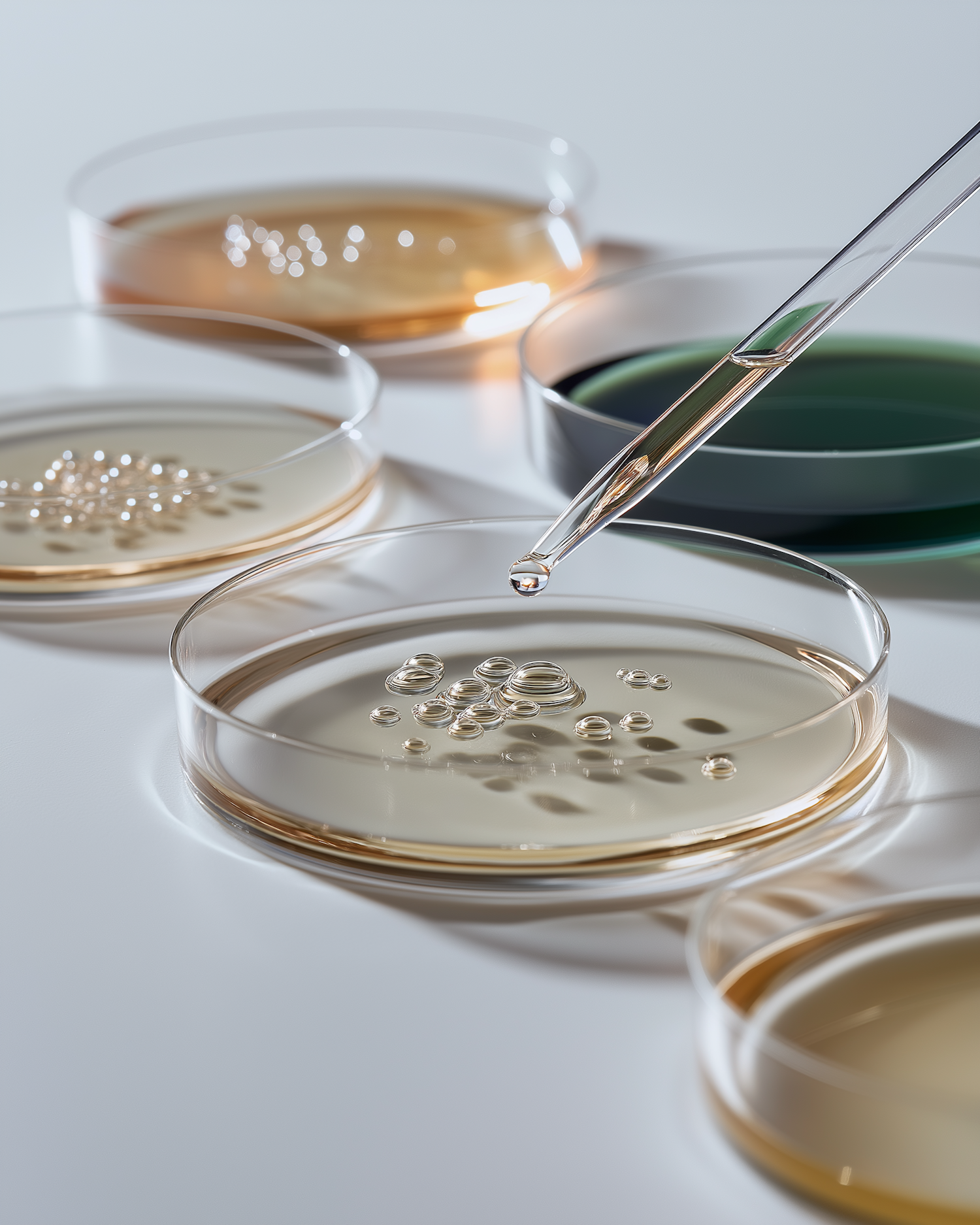 A pipette dropping liquid into a petri dish amongst others filled with various solutions, showcasing a scientific setting.