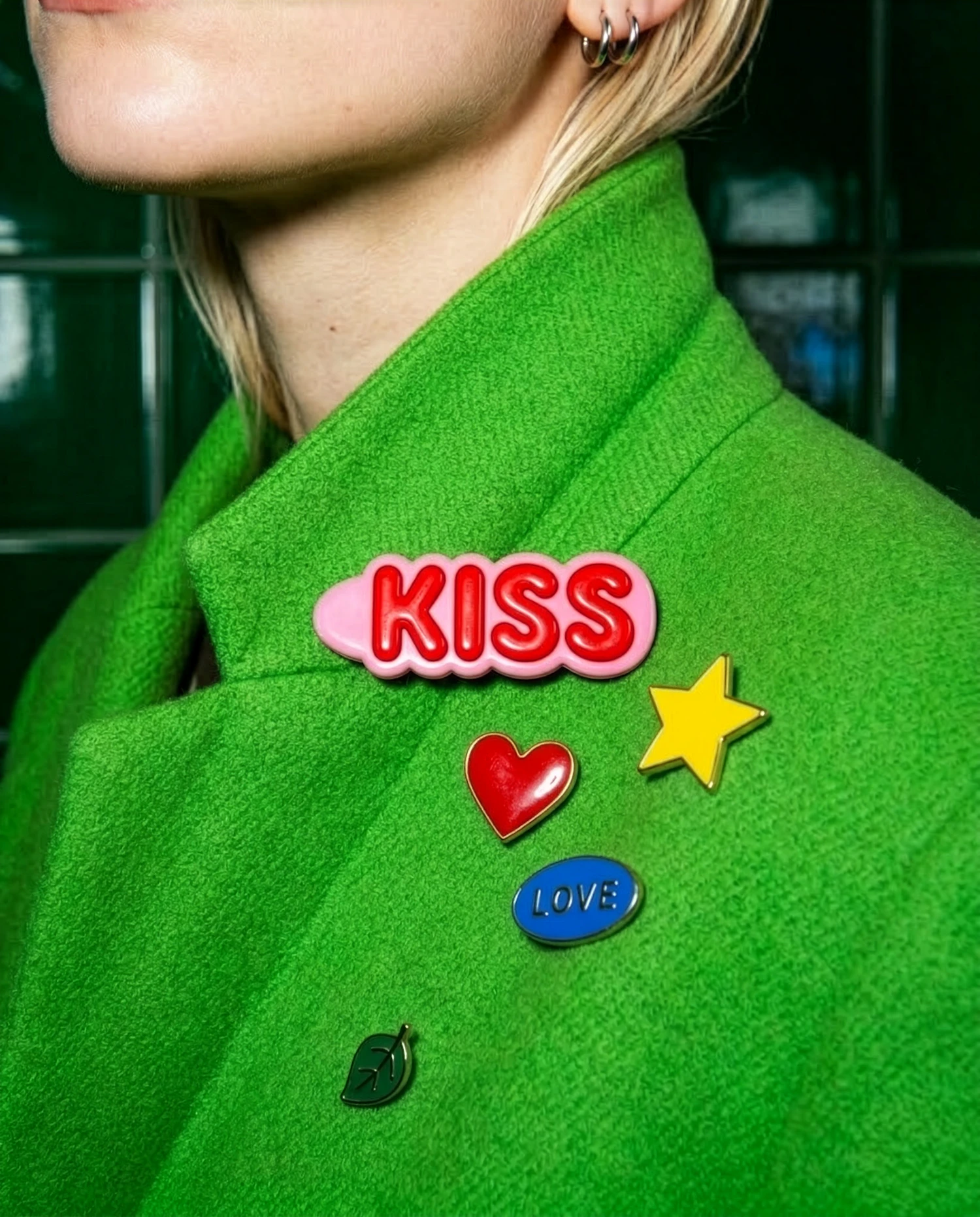 A vibrant green coat with colorful pins, including 'KISS', 'LOVE', and a heart, worn by a person with blonde hair and silver earrings.