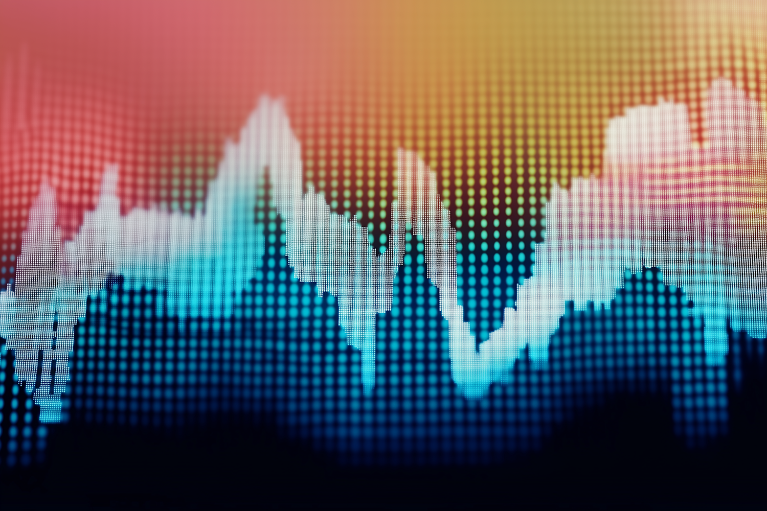 Colorful pixelated graph with sharp peaks and valleys, set against a gradient background of warm and cool tones. Perfect for tech themes.
