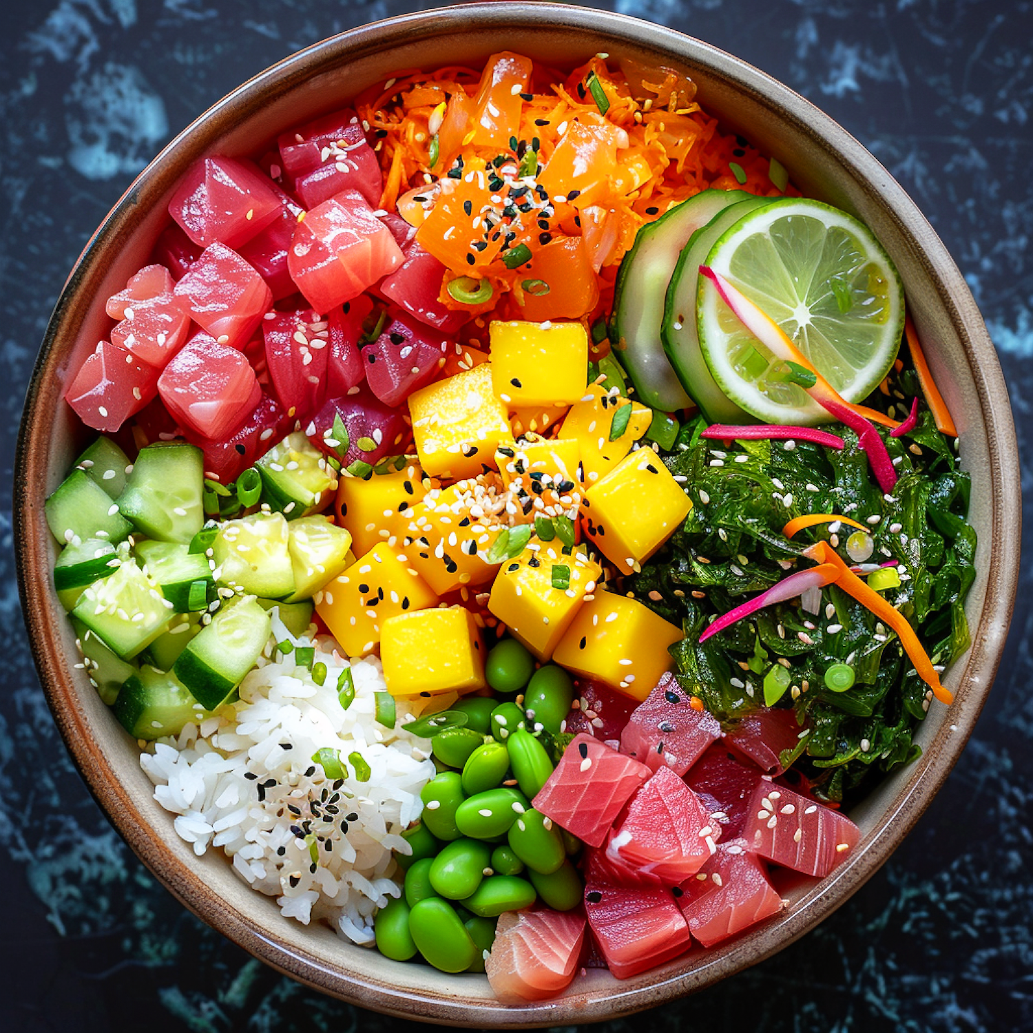 Colorful poke bowl with tuna, salmon, mango, cucumber, edamame, and seaweed salad, topped with sesame seeds and lime.