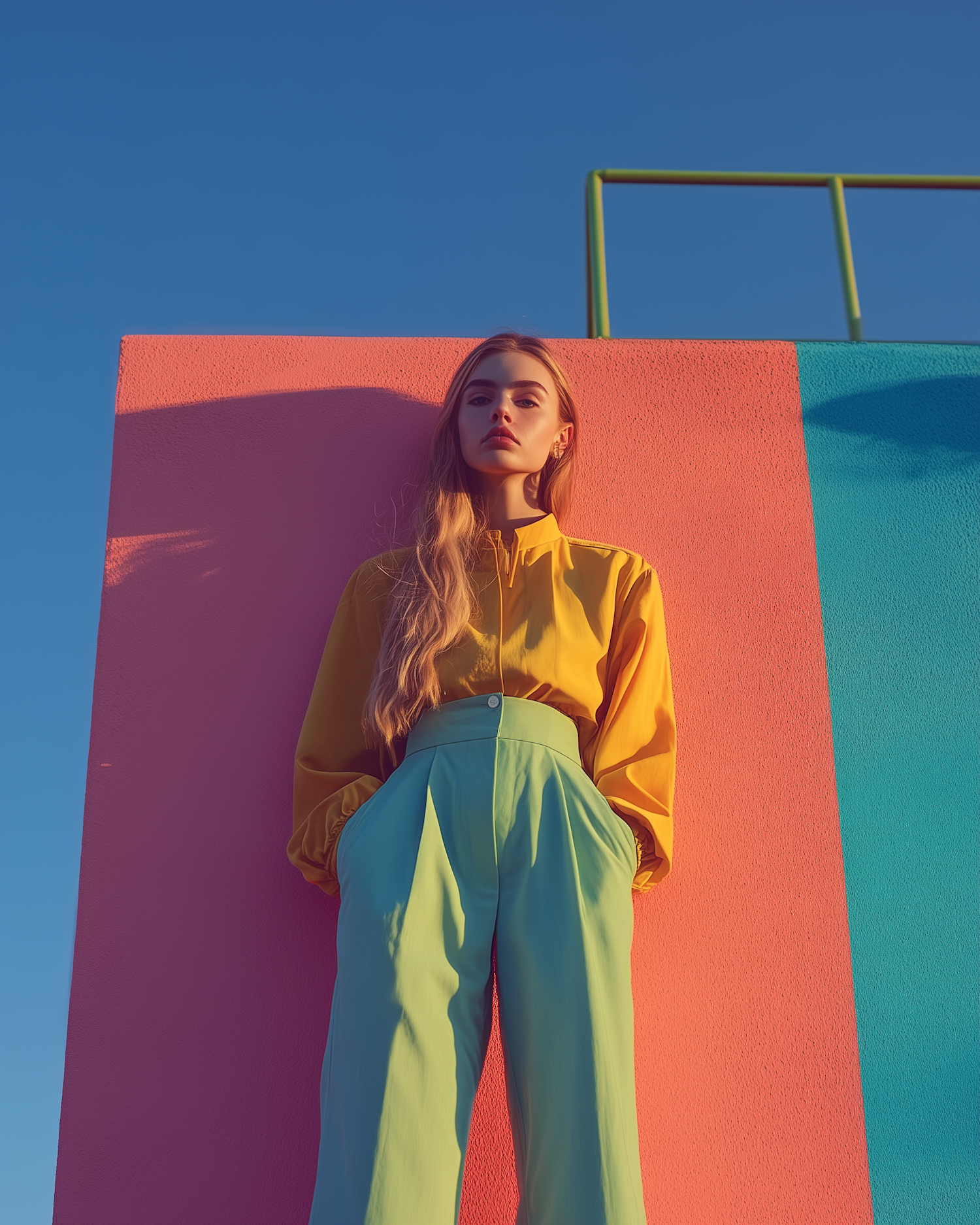 Stylish woman in yellow and green outfit against a vibrant pink and teal wall under a clear blue sky.