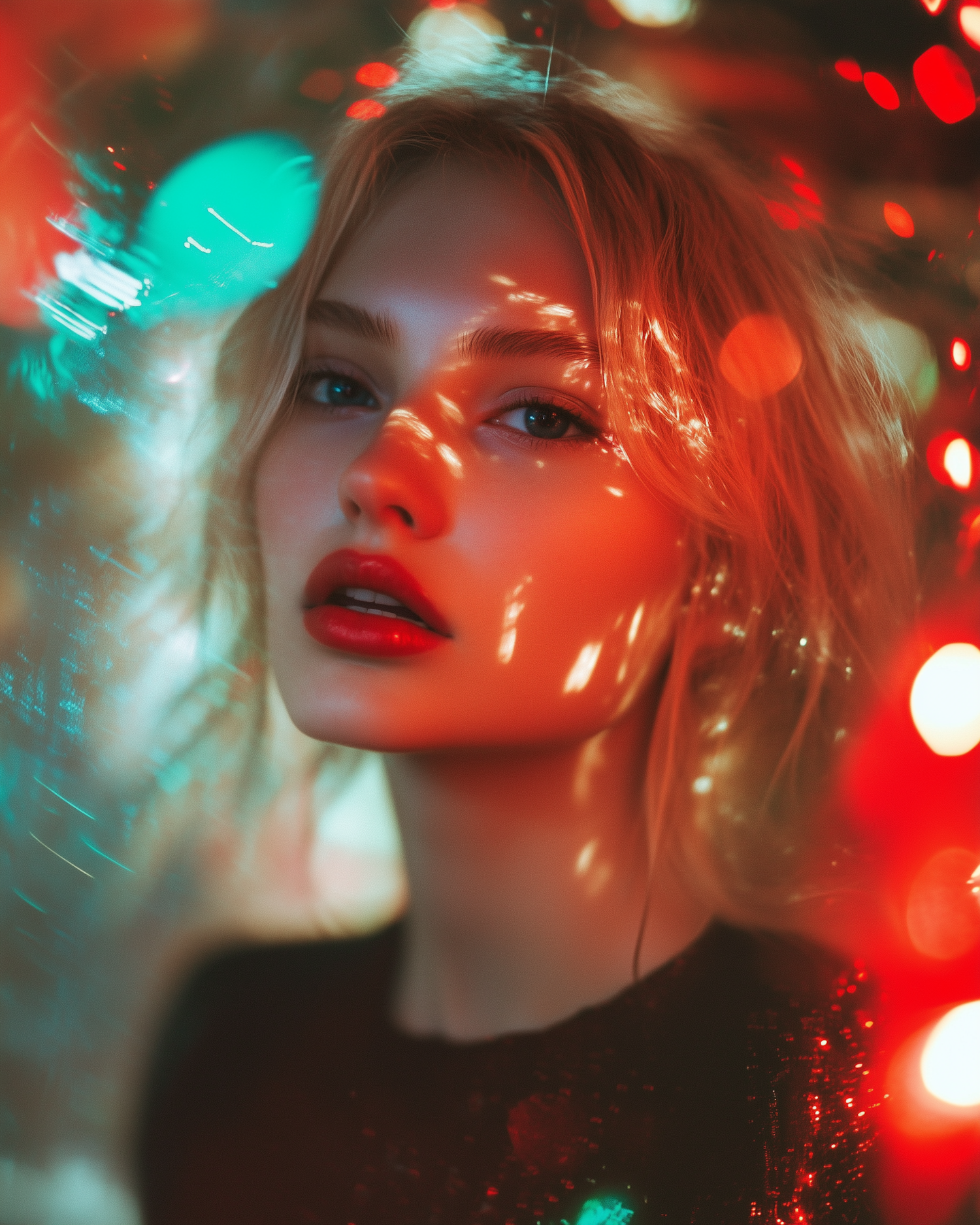 Ethereal portrait of a blonde woman with red lips, surrounded by dreamy red and teal bokeh lights.