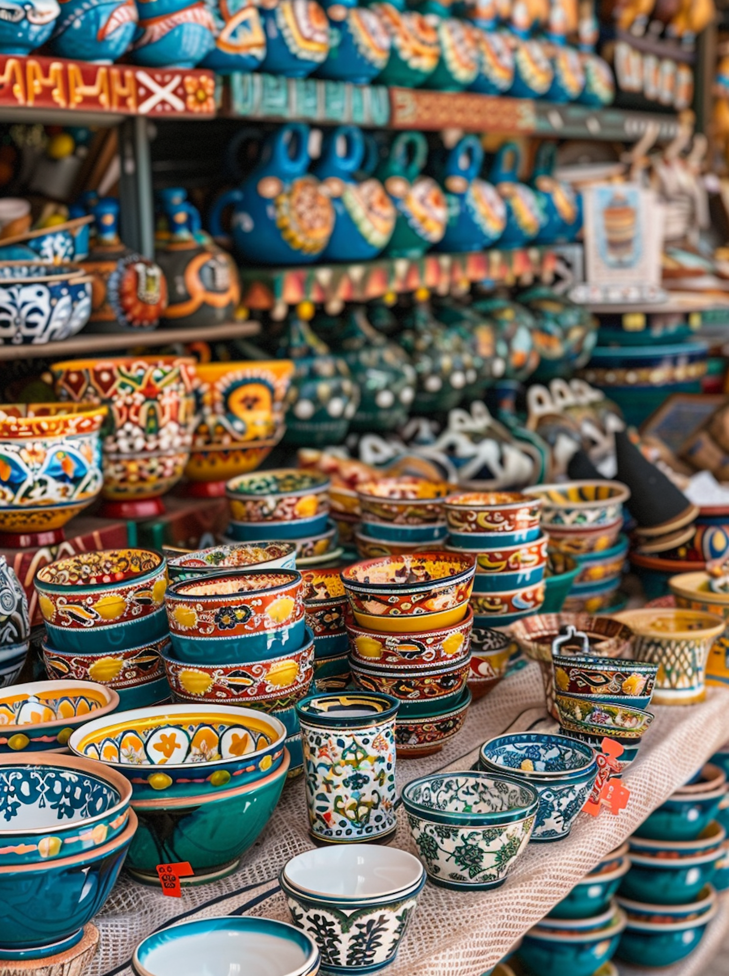 Colorful ceramic bowls and pots with intricate designs, showcasing vibrant patterns and cultural artistry in a captivating display.