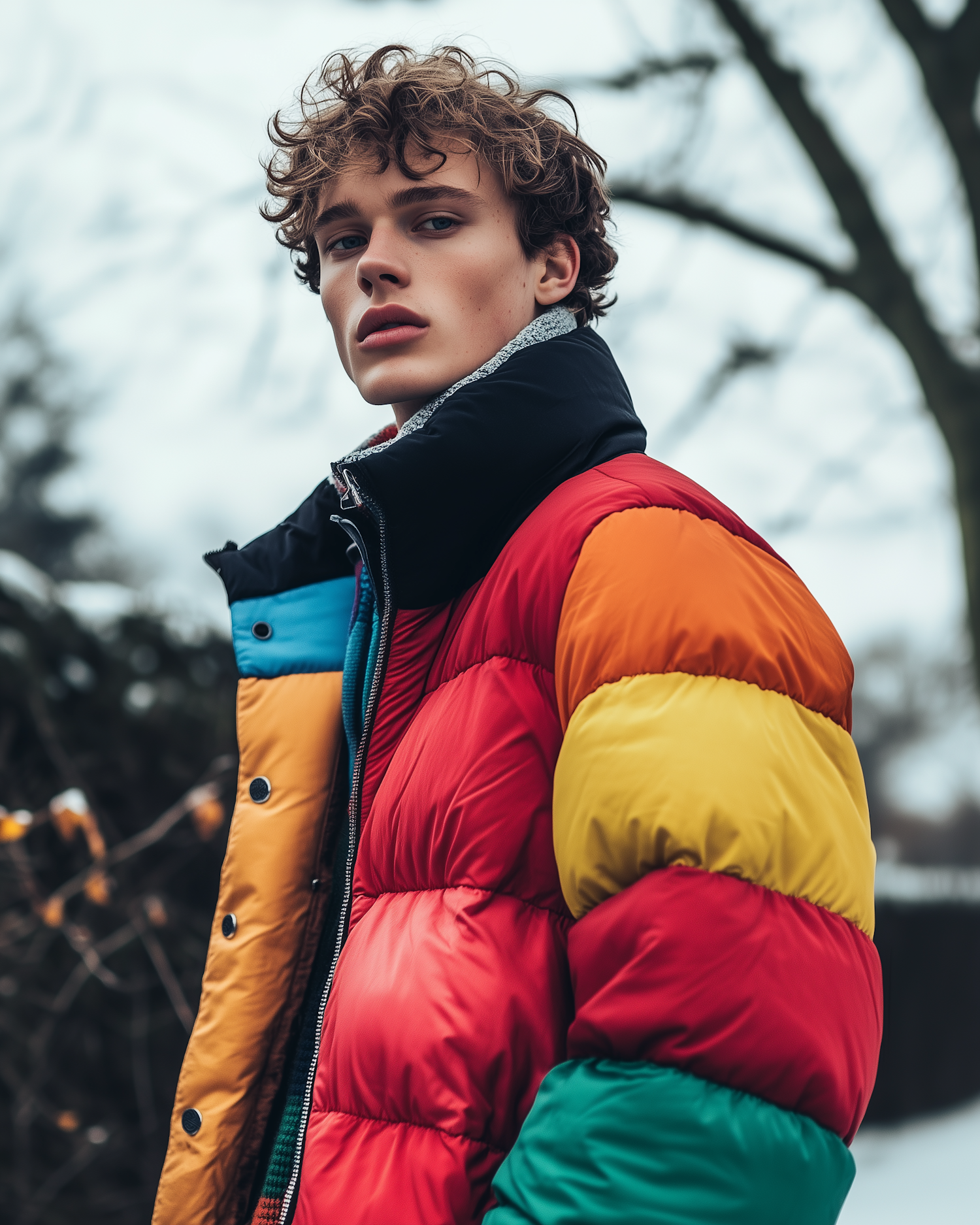 Young man in a colorful puffer jacket stands outdoors, exuding confidence against a wintery backdrop. Vibrant fashion meets serene nature.