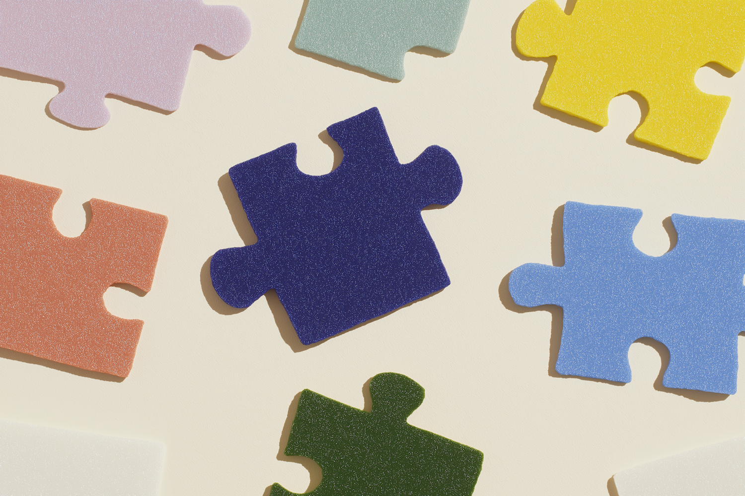 Colorful, textured puzzle pieces scattered on a light background, featuring vibrant hues like blue, yellow, and green. Perfect for designs.