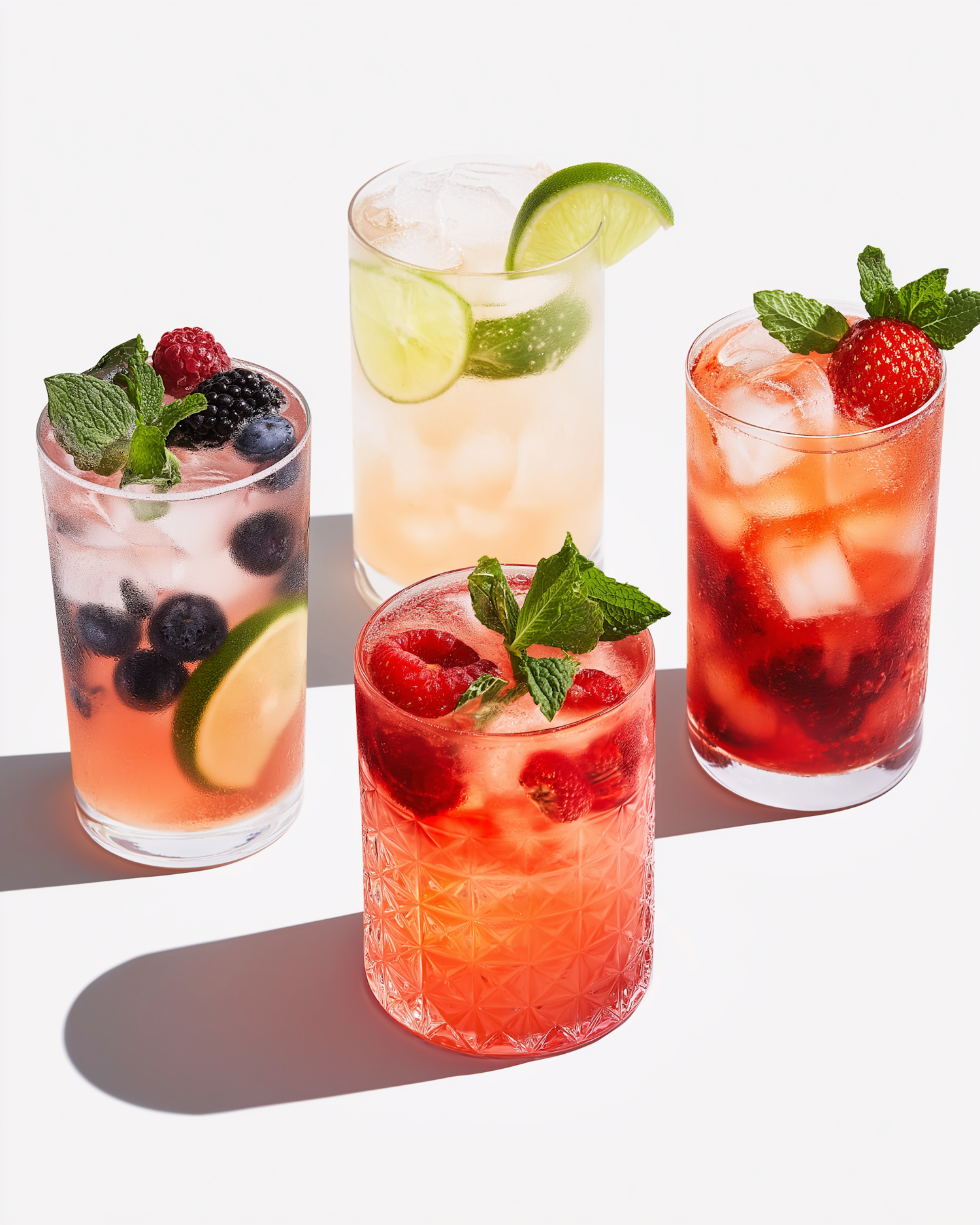 Four colorful cocktails with fresh fruit and mint garnishes on a white background, perfect for a refreshing summer vibe.
