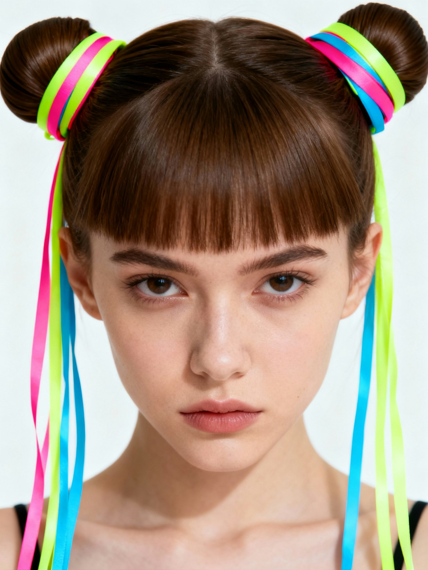 Studio portrait, plain white seamless background, soft even lighting, clean editorial aesthetic, no shadows, high detail, realistic photography, sharp focus on face and hair accessories Close-up of a young woman with fair porcelain skin, straight chestnut hair styled into two sleek space buns. She faces the camera with a serious expression, head slightly tilted forward. Each bun is wrapped with neon ribbons in pink, lime green, and electric blue, cascading down like playful streamers.