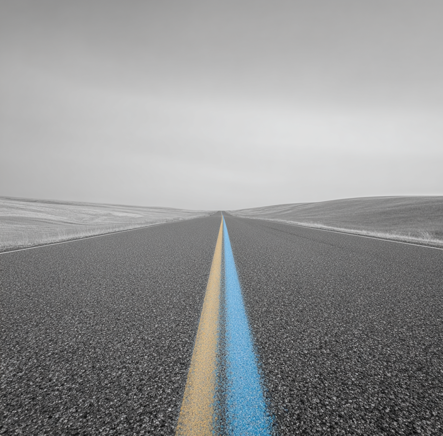 Straight asphalt road with striking yellow and blue stripes under an overcast sky, standing out amidst muted gray surroundings.