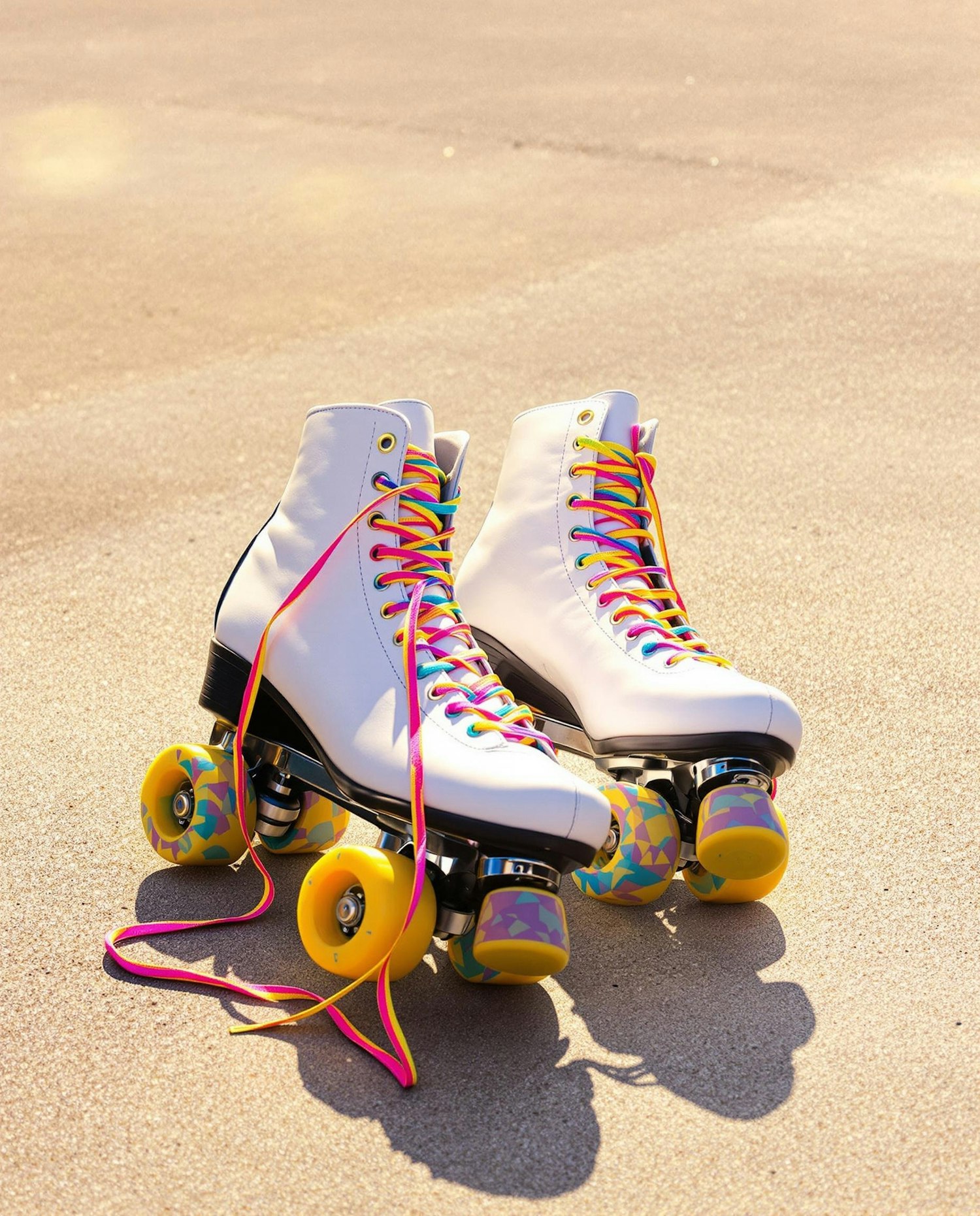 A pair of white roller skates with colorful laces lying casually on a warm concrete surface. Shadows are crisp, the scene feels like an afternoon break. Colors are punchy, with a playful retro aesthetic.