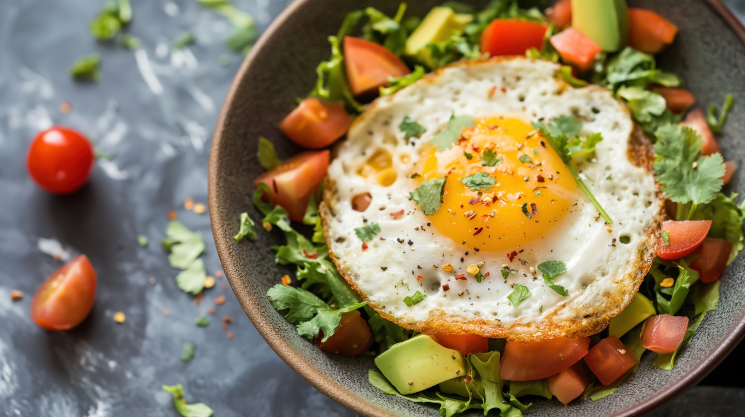 Delicious sunny-side-up egg on a bed of fresh greens, tomatoes, and avocado, garnished with cilantro and spices in a rustic bowl.