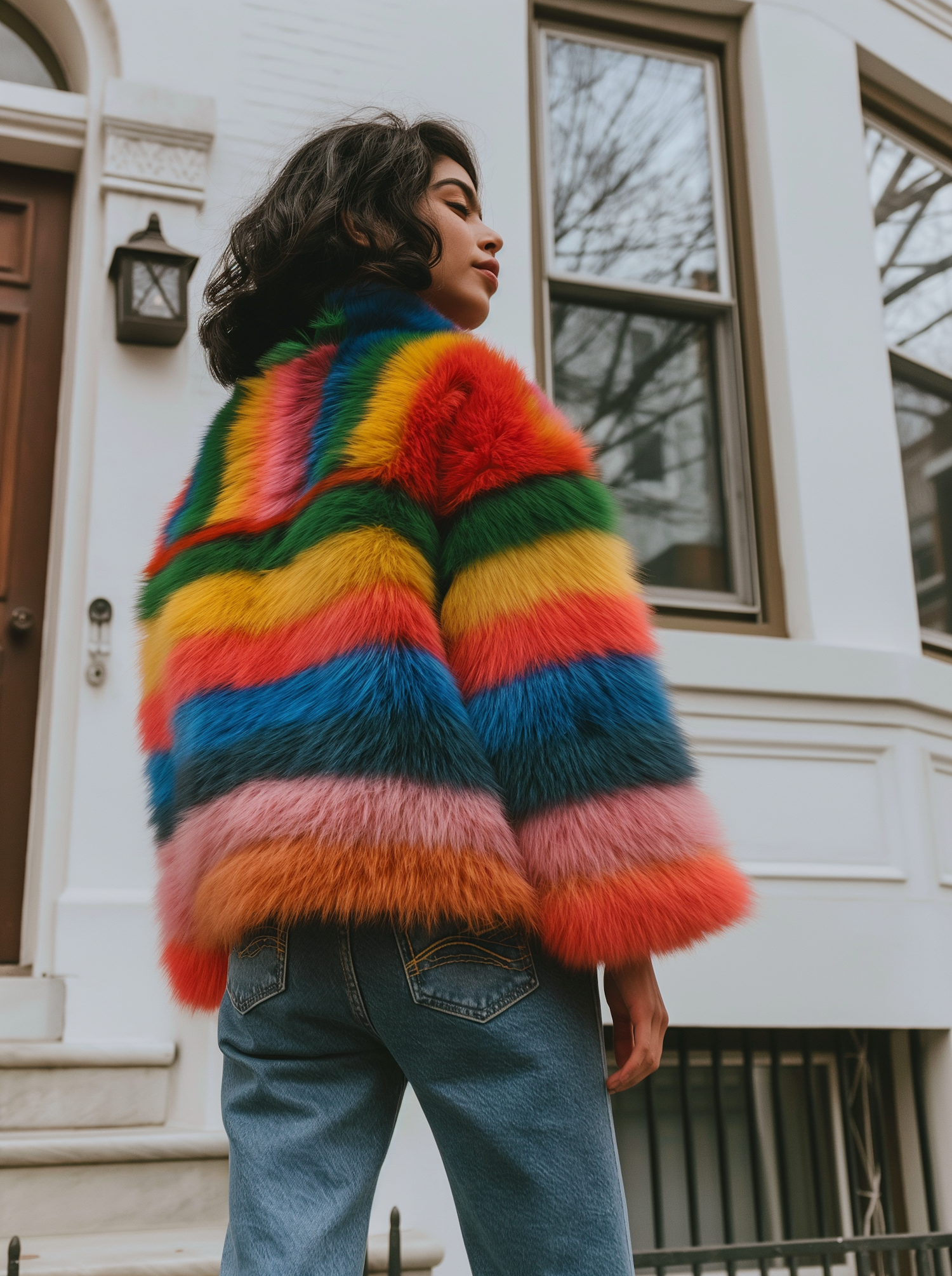 Woman in a vibrant multicolored fur coat stands confidently in an urban setting, showcasing bold fashion against a classic architectural backdrop.