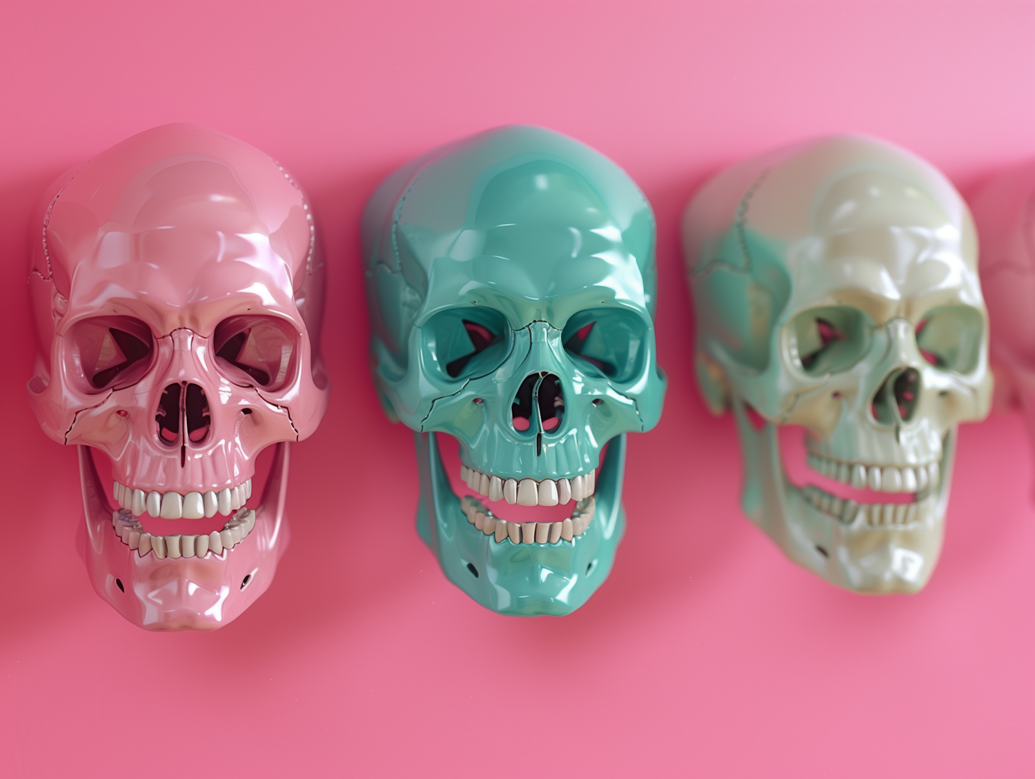Three glossy, colorful skulls in pink, teal, and cream against a vibrant pink background, creating a playful yet eerie artistic scene.