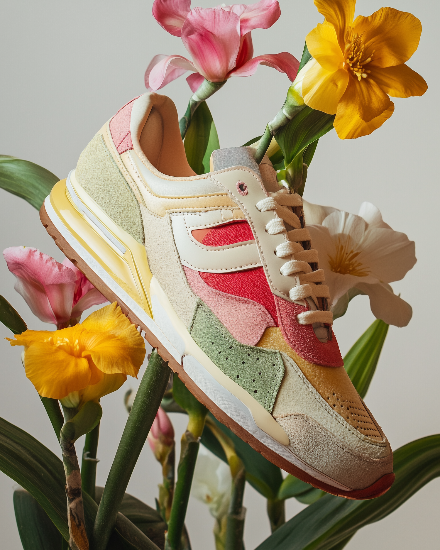 Colorful sneaker surrounded by vibrant flowers, featuring pastel hues and a modern design. Perfect blend of fashion and nature.