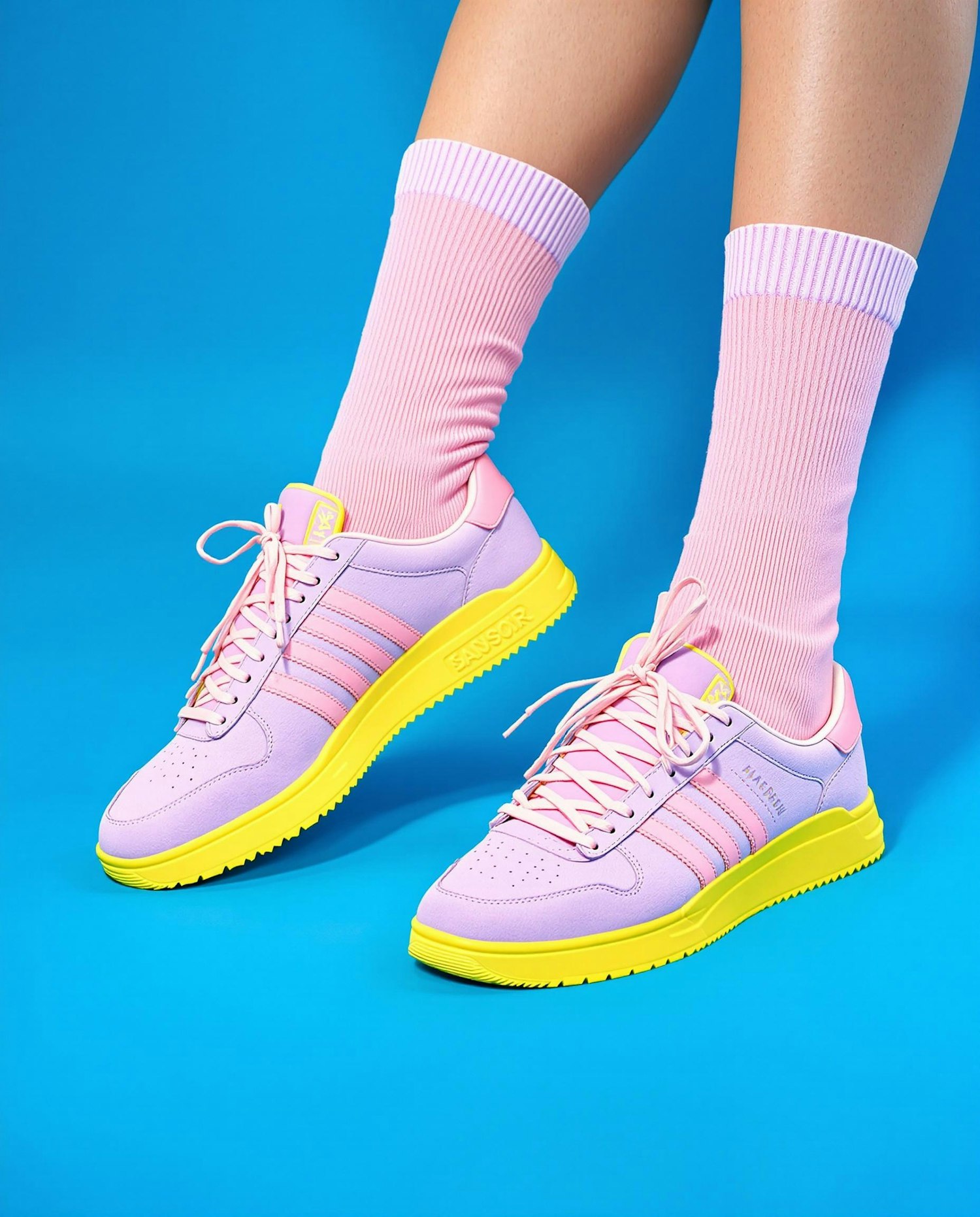 A studio fashion photoshoot with soft diffused lighting, clean background, high contrast between subject and backdrop, focus on sneakers and socks styled together, clean composition, professional product photography style — lavender sneakers with bright yellow soles, worn with soft pink socks, bold electric blue background