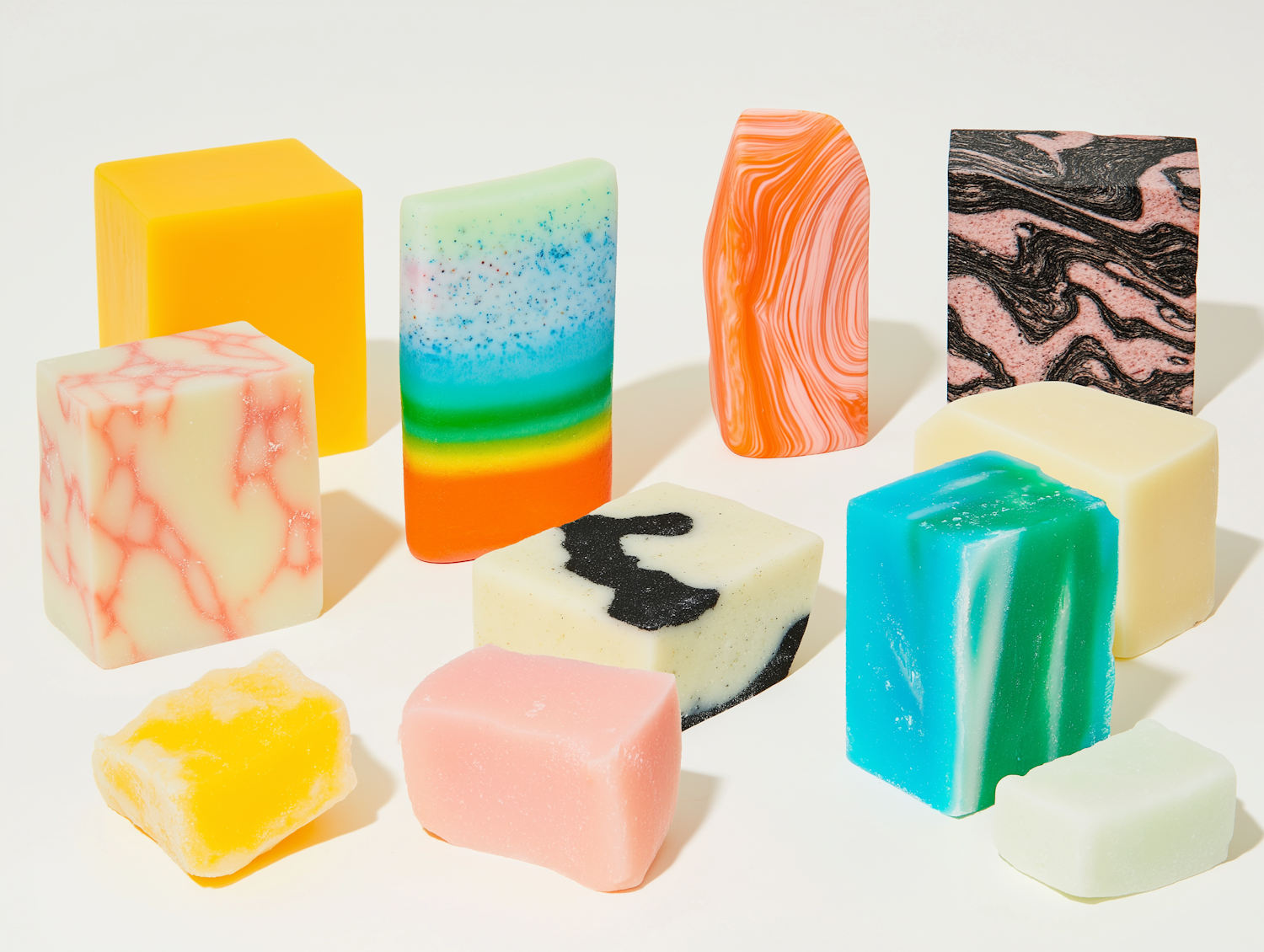 Vibrant collection of uniquely shaped and colorful soap bars with marbled and gradient designs on a light background.