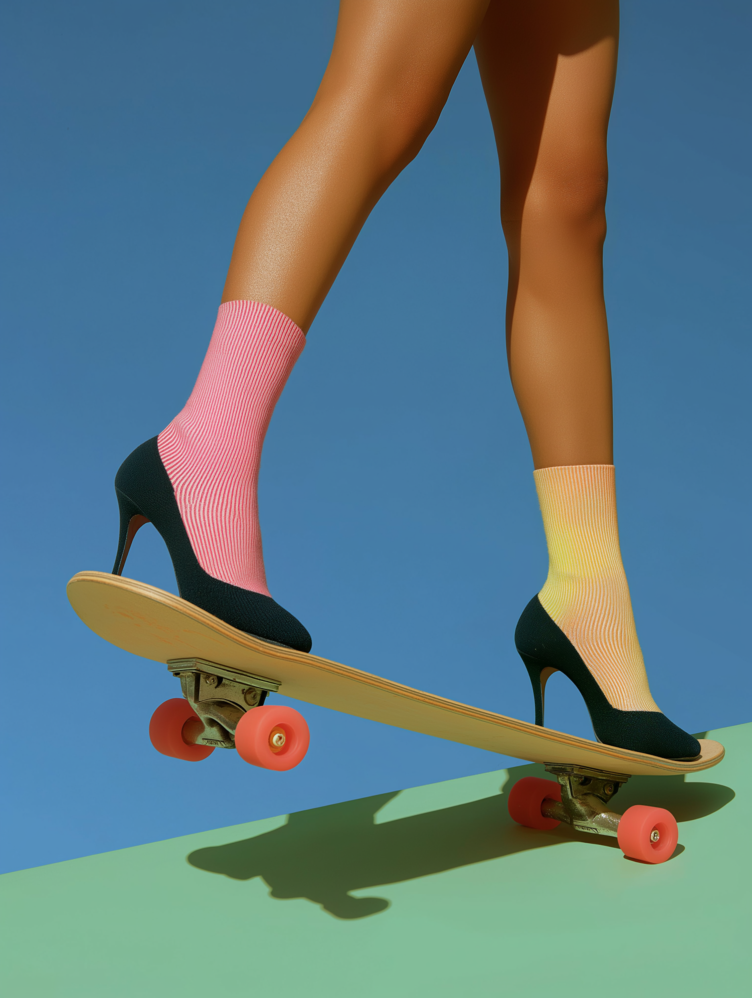 A playful scene of legs in mismatched socks and high heels balancing on a skateboard, set against a vibrant blue and green background.