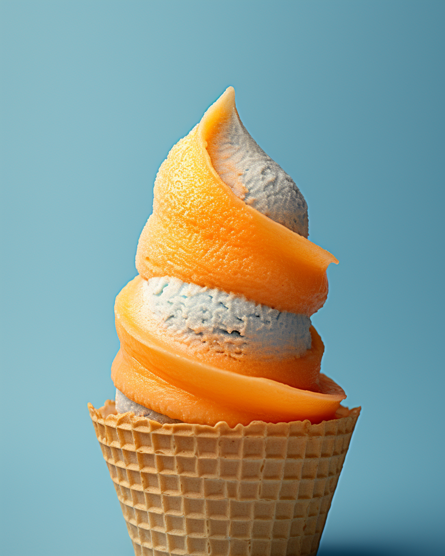 Vibrant orange and grayish-blue soft-serve ice cream in a waffle cone against a light blue background.
