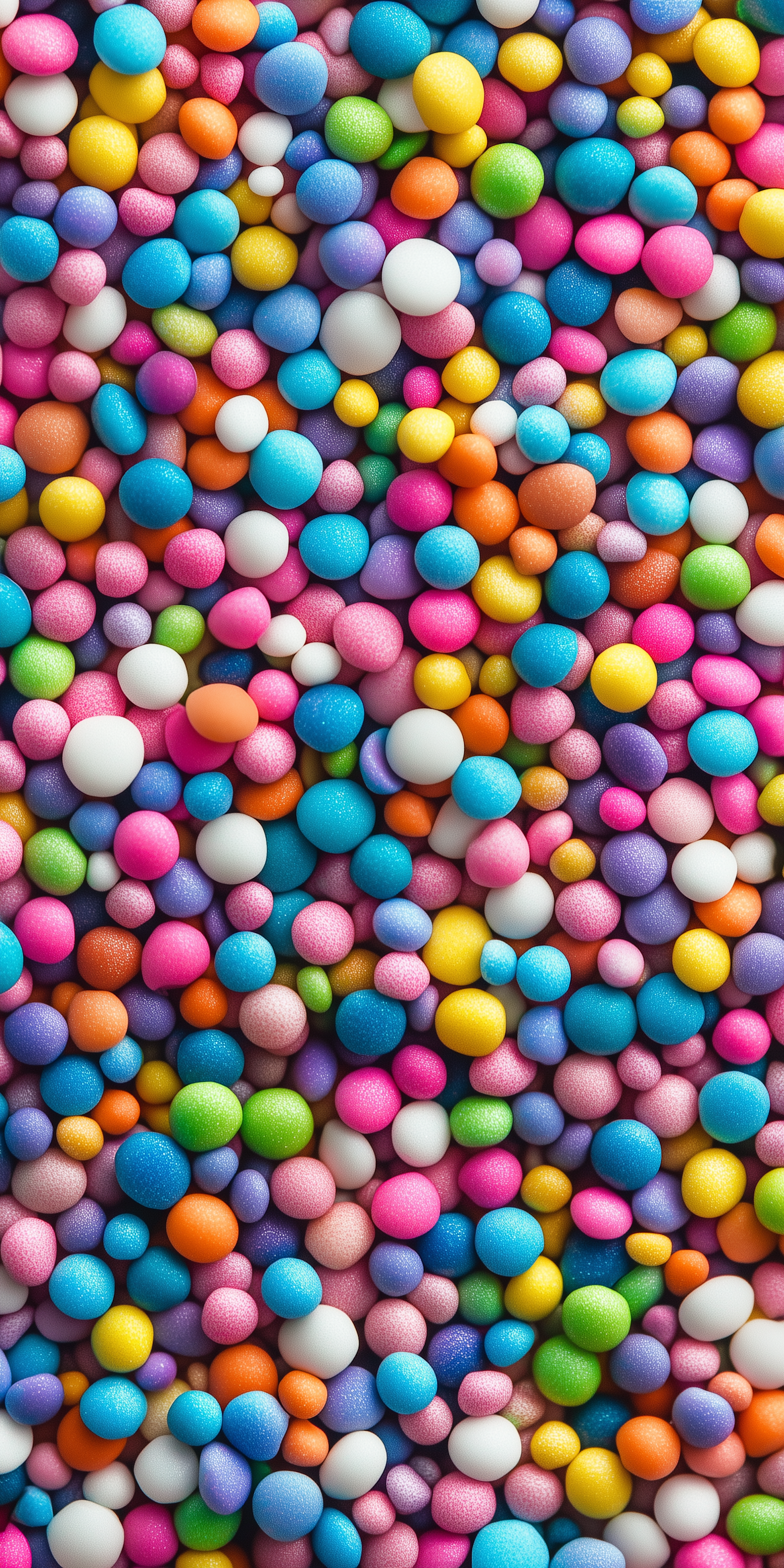Bright and colorful spheres in various sizes and glittery textures create a playful, candy-like pattern full of vibrant hues.