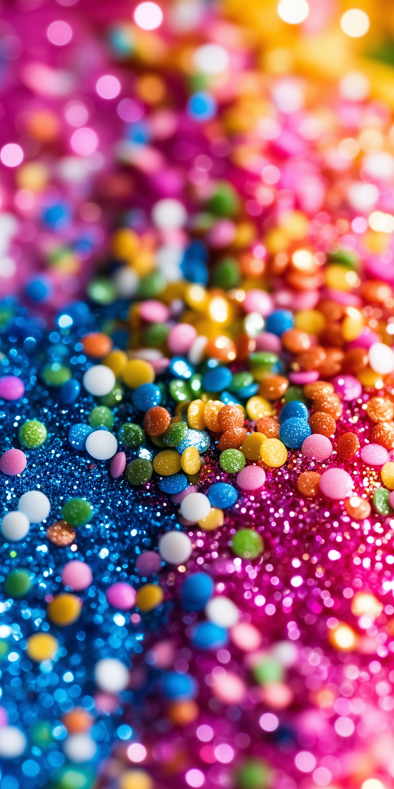 Bright close-up of colorful sprinkles and glitter, with vibrant hues of blue, pink, and yellow creating a playful, festive vibe.