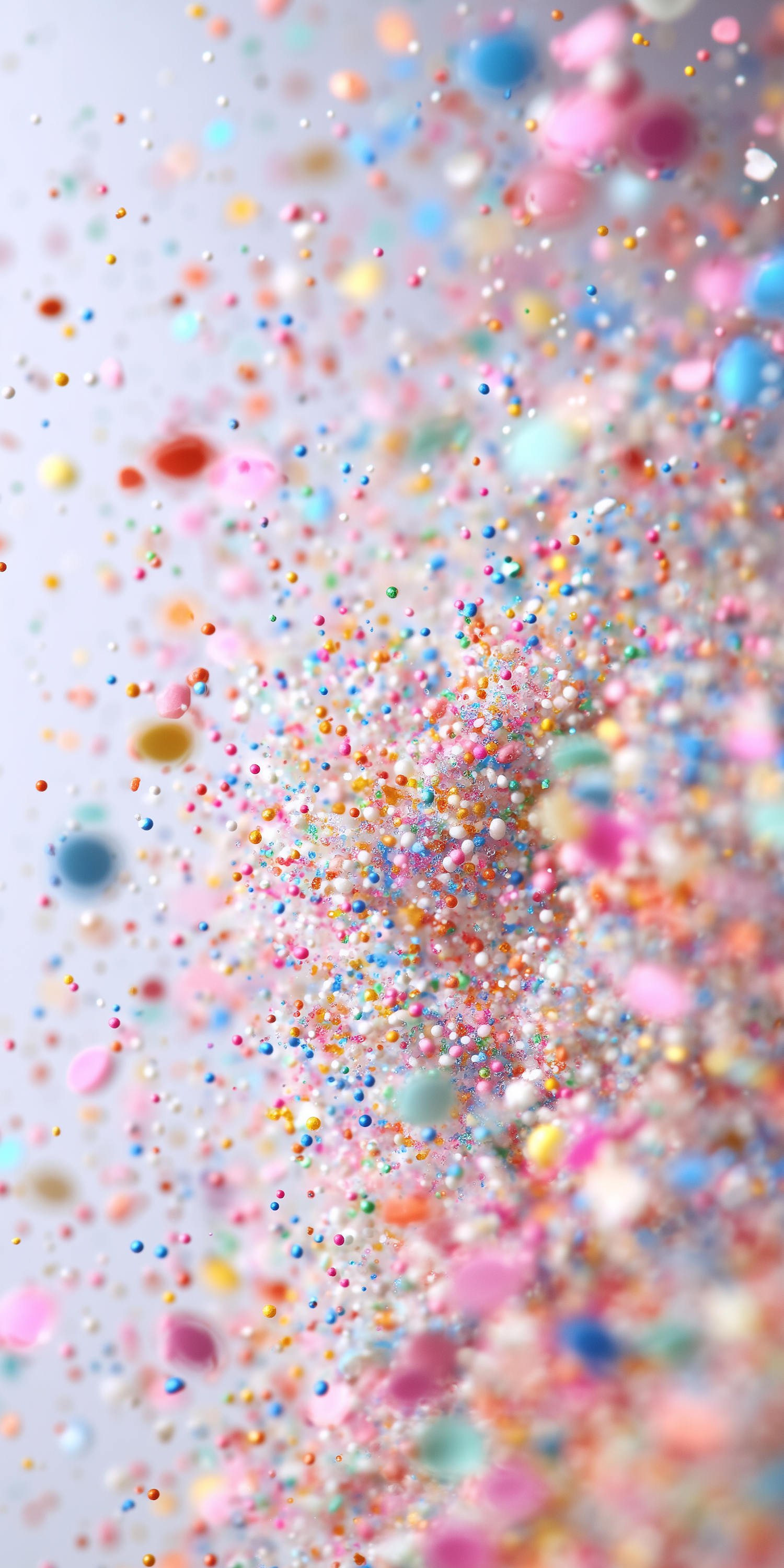 A lively close-up of colorful sprinkles in mid-air, creating a festive and dynamic scene with vibrant pinks, blues, yellows, and more.