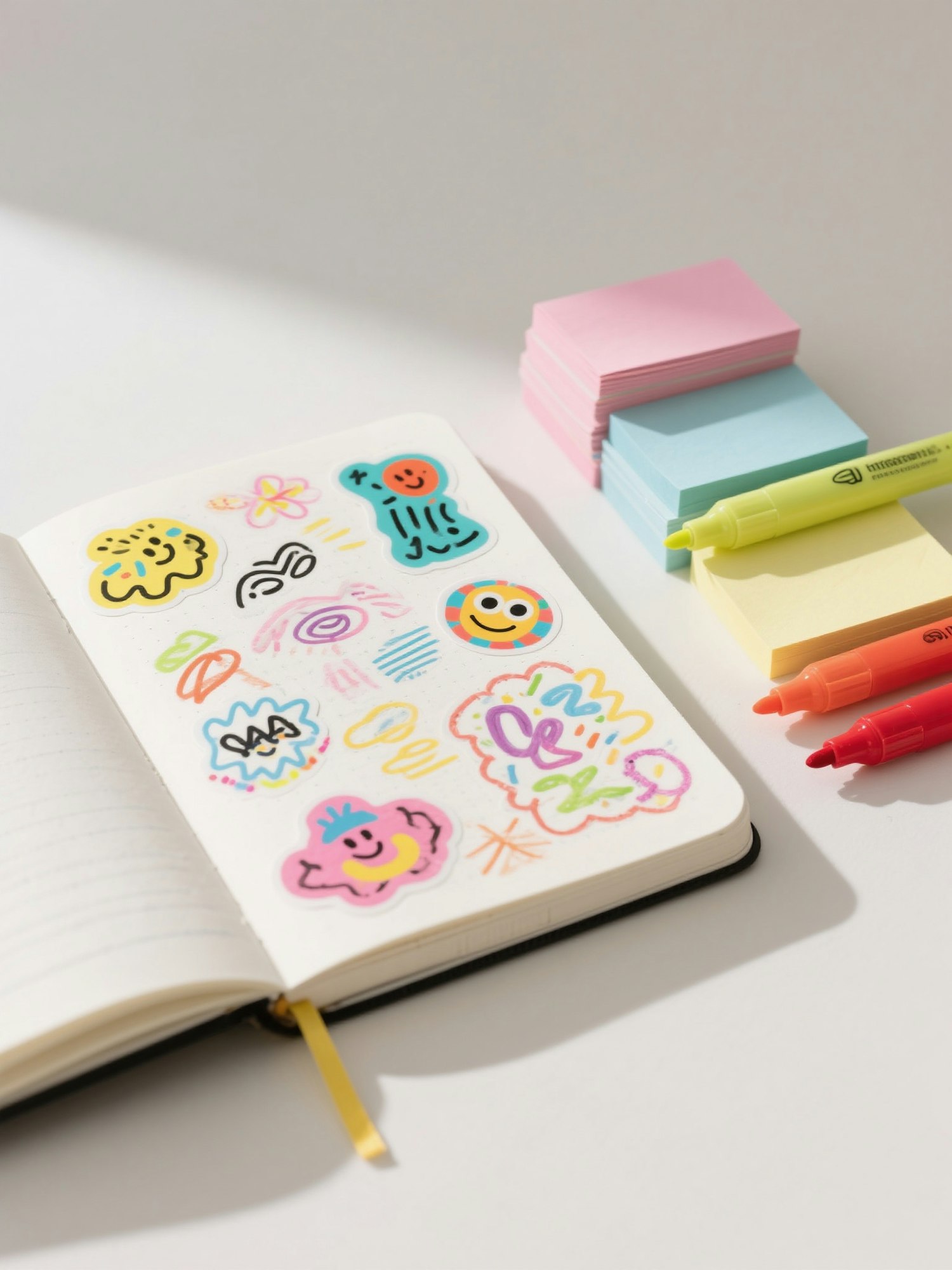 A bold and playful studio scene with bright pastel lighting, soft shadows, minimal background. Color palette limited to soft pink, baby blue, off-white, pale yellow and pop red. Smooth surfaces, clean layout, flat lay or isometric compositions, fun and modern vibe, high resolution. An open notebook with doodles, stickers, and colorful scribbles, next to pastel highlighters and sticky notes.