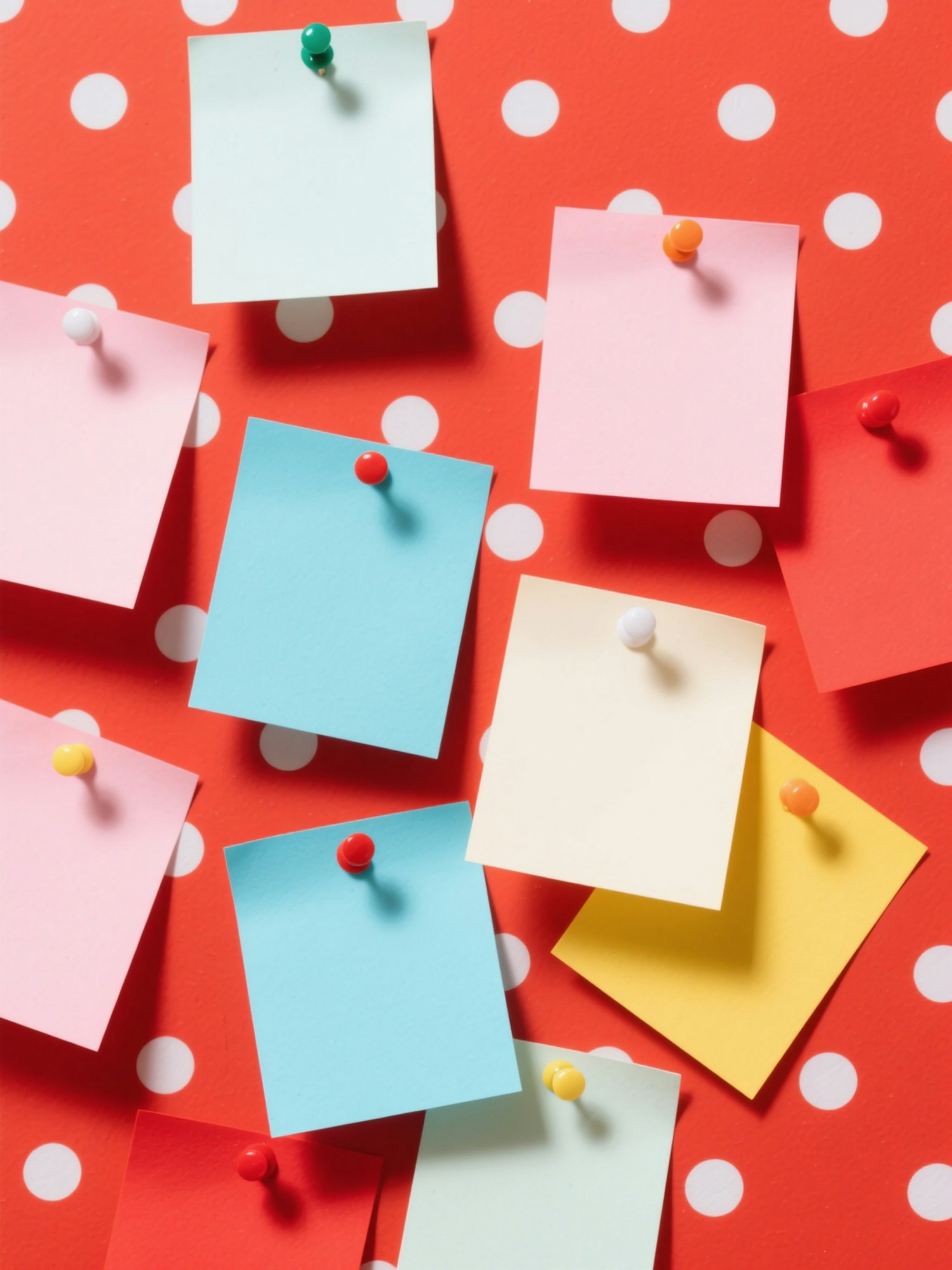 A bold and playful studio scene with bright pastel lighting, soft shadows, minimal background. Color palette limited to soft pink, baby blue, off-white, pale yellow and pop red. Smooth surfaces, clean layout, flat lay or isometric compositions, fun and modern vibe, high resolution. A scene with a red polka dot background and various paper notes pinned like a moodboard, colorful and dynamic.