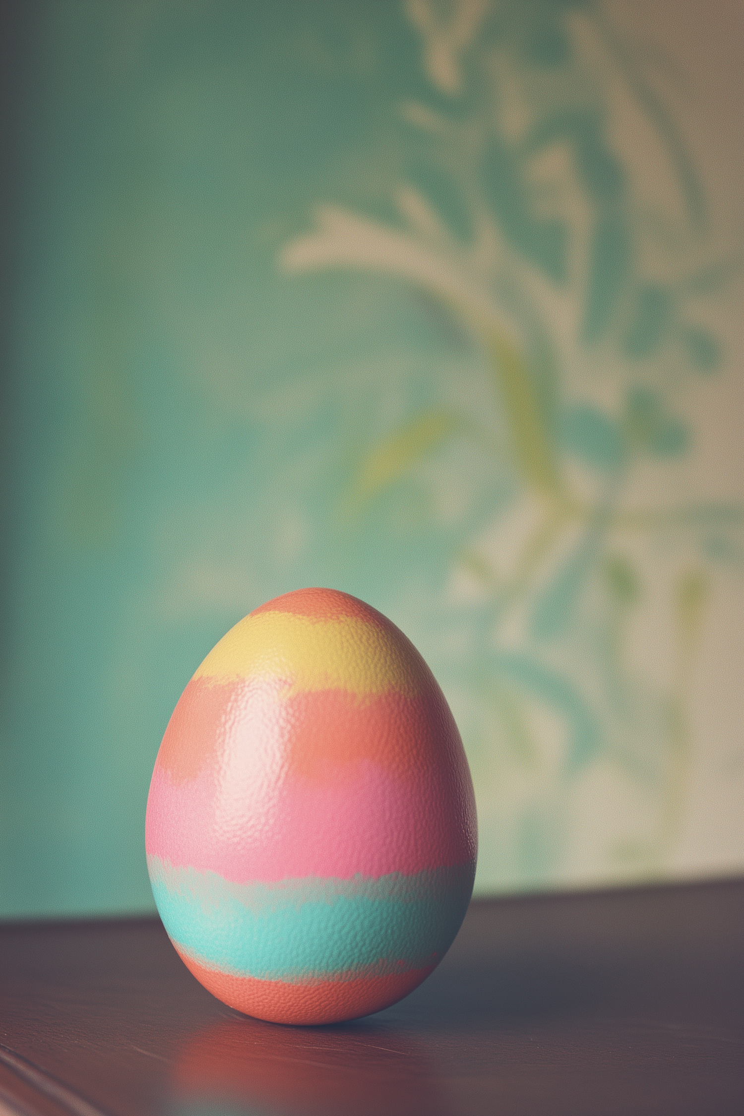 Vibrant striped egg with yellow, pink, orange, and teal colors on a wooden surface, set against a soft-focus abstract background.