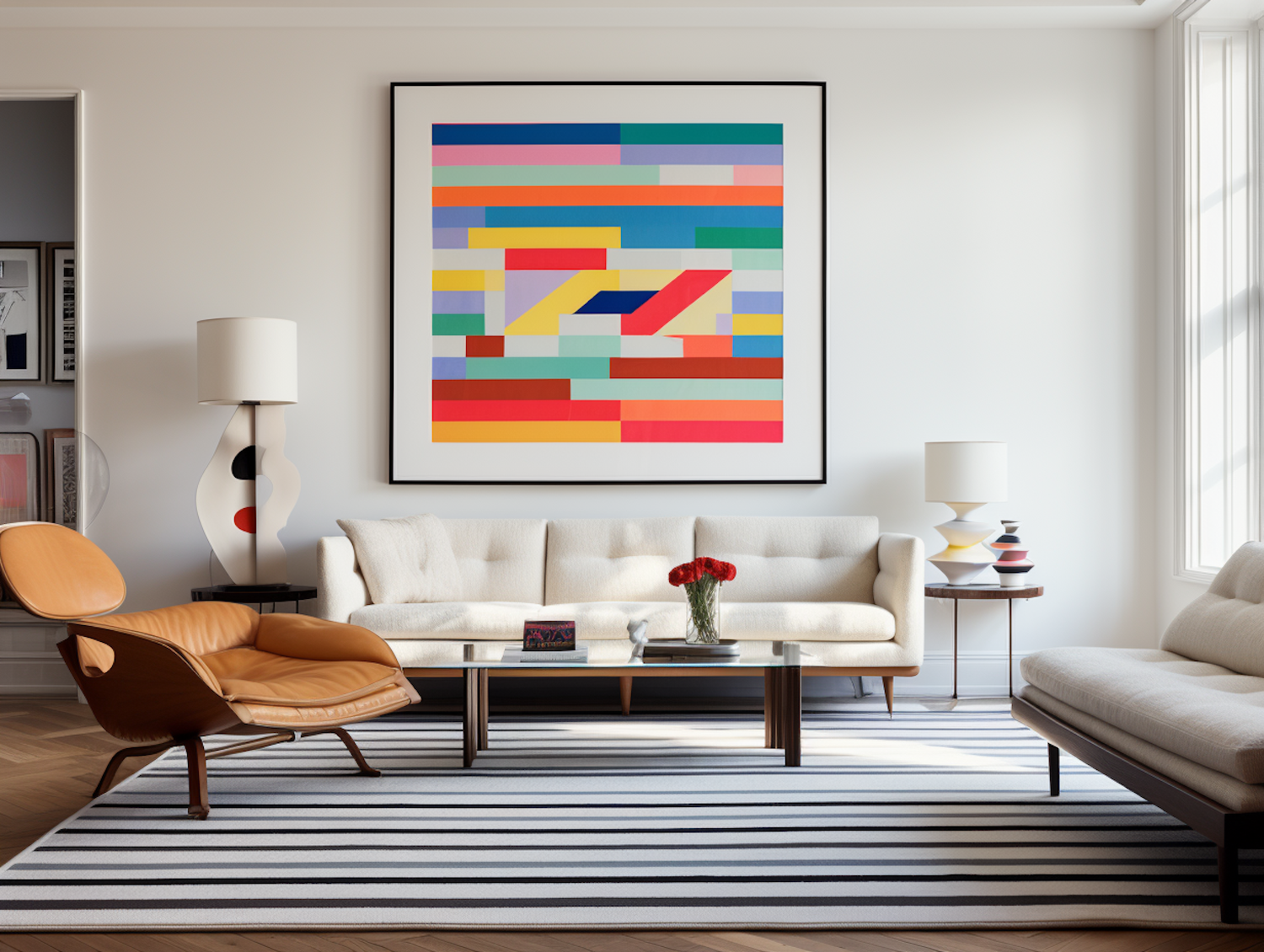 Modern living room with abstract art, mid-century furniture, and a striped rug. Bright and inviting space with natural light.