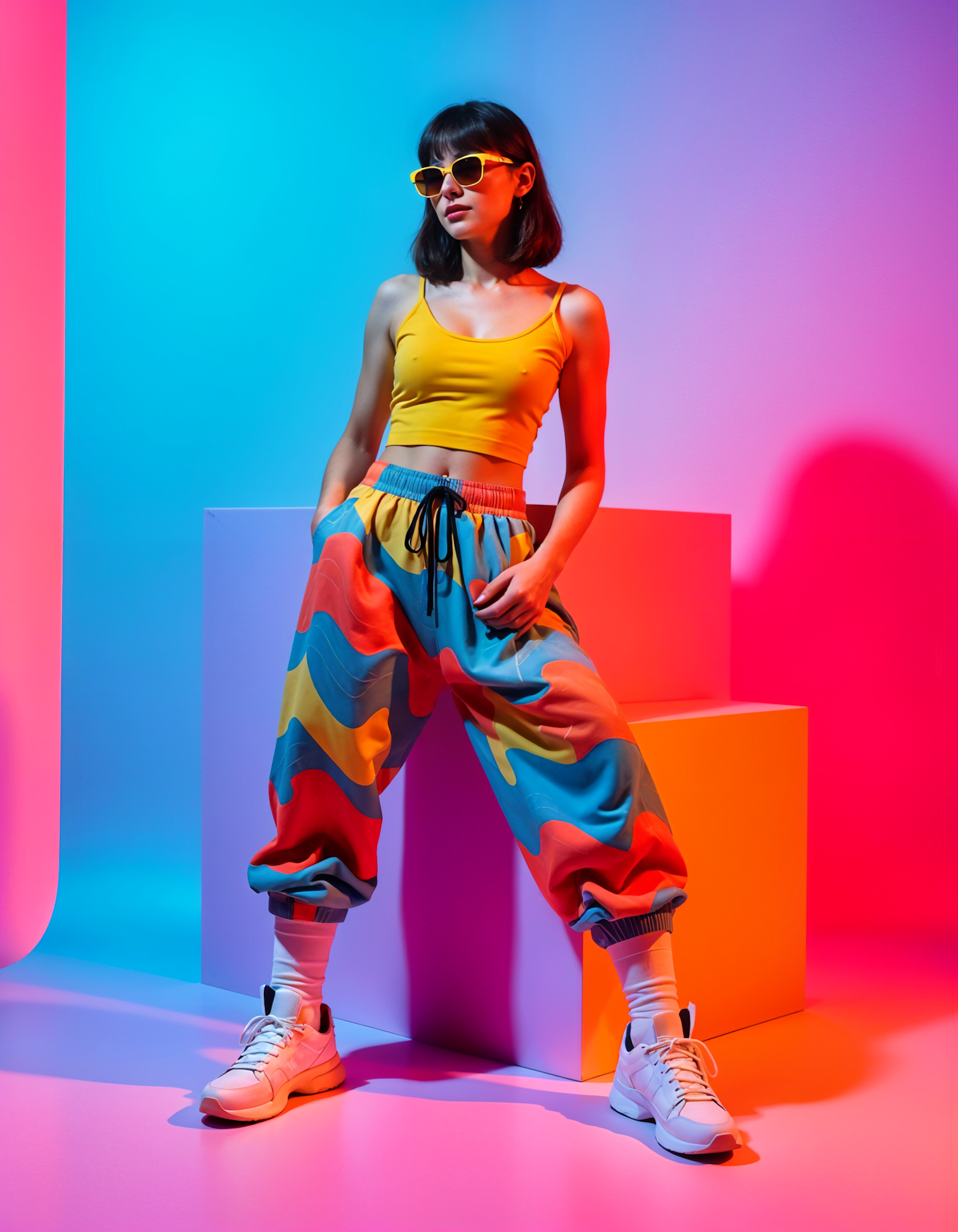 Stylish woman in a yellow tank top and colorful joggers poses in a vibrant studio with bold lighting and geometric accents.