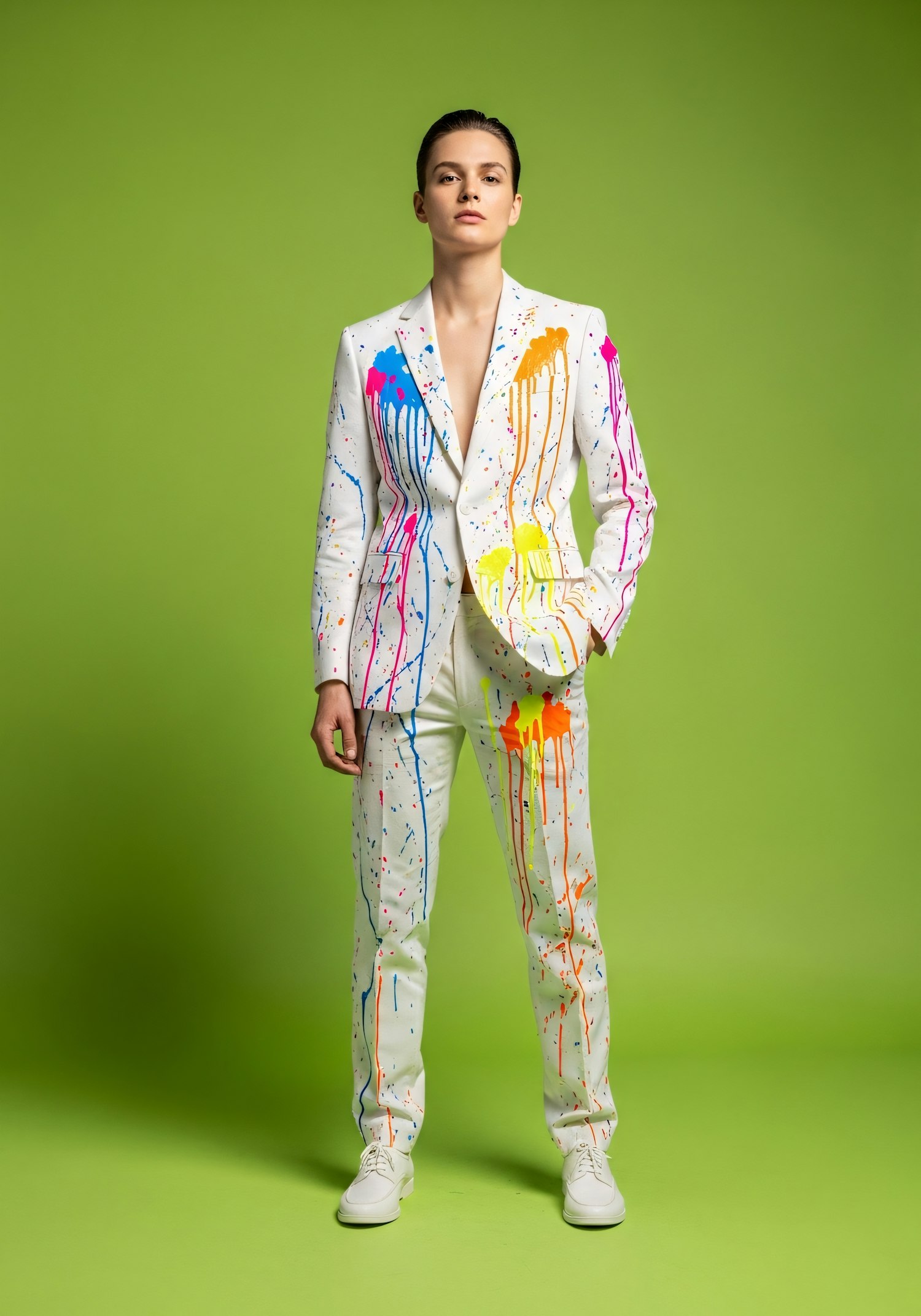 A person in a white suit with colorful paint splatters stands against a green background, showcasing a bold and artistic fashion statement.