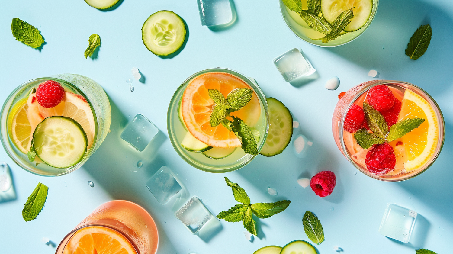 Refreshing infused water with cucumber, citrus, raspberries, and mint on a blue background. Perfect for a summer vibe.