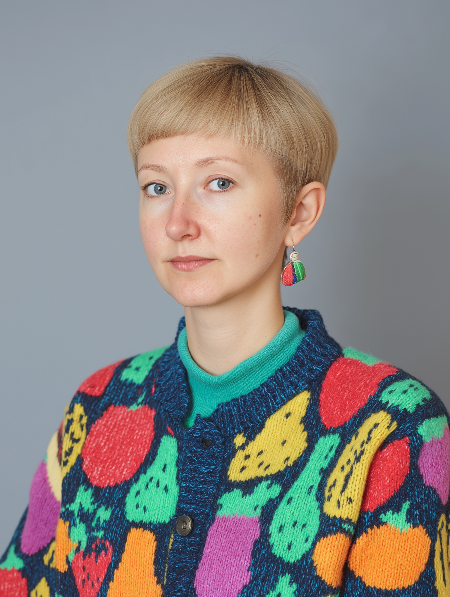 A person with short blonde hair wearing a vibrant fruit-patterned sweater and watermelon earrings against a gray background.