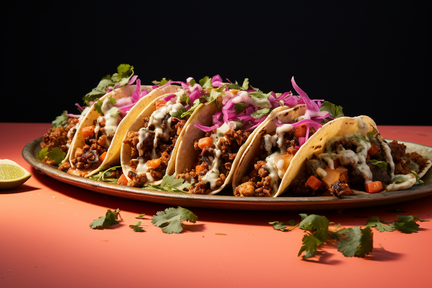 Delicious tacos filled with meat, veggies, and topped with pickled onions and cilantro on a vibrant platter.