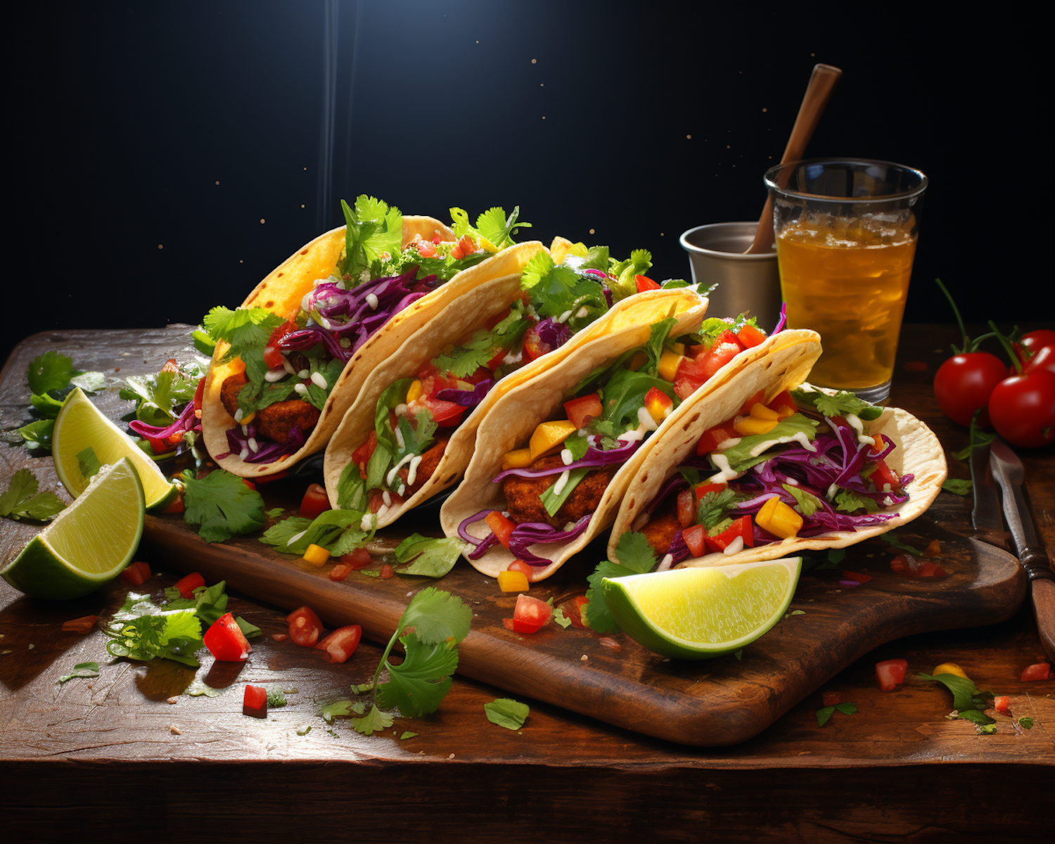 Colorful tacos with fresh veggies and lime on a wooden board, accompanied by a refreshing drink in a cozy setting.