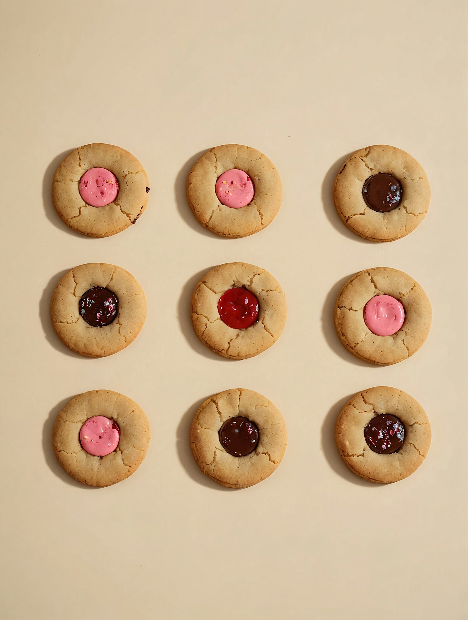 A grid of thumbprint cookies with pink frosting, chocolate, and red jam fillings on a beige background. Perfect for dessert inspiration.