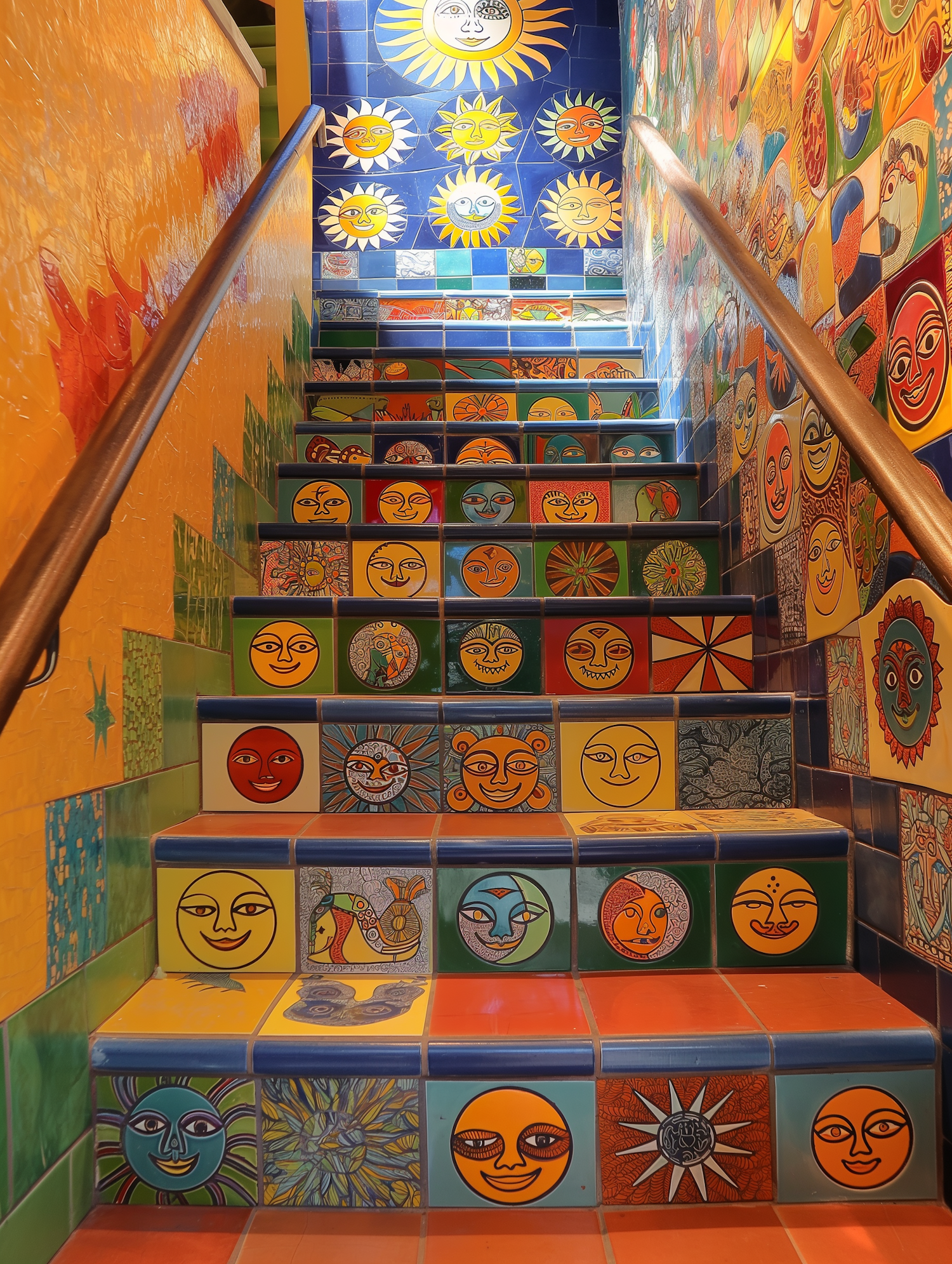 Colorful staircase with sun-themed tiles, featuring vibrant designs and smiling faces, creating a lively and artistic atmosphere.
