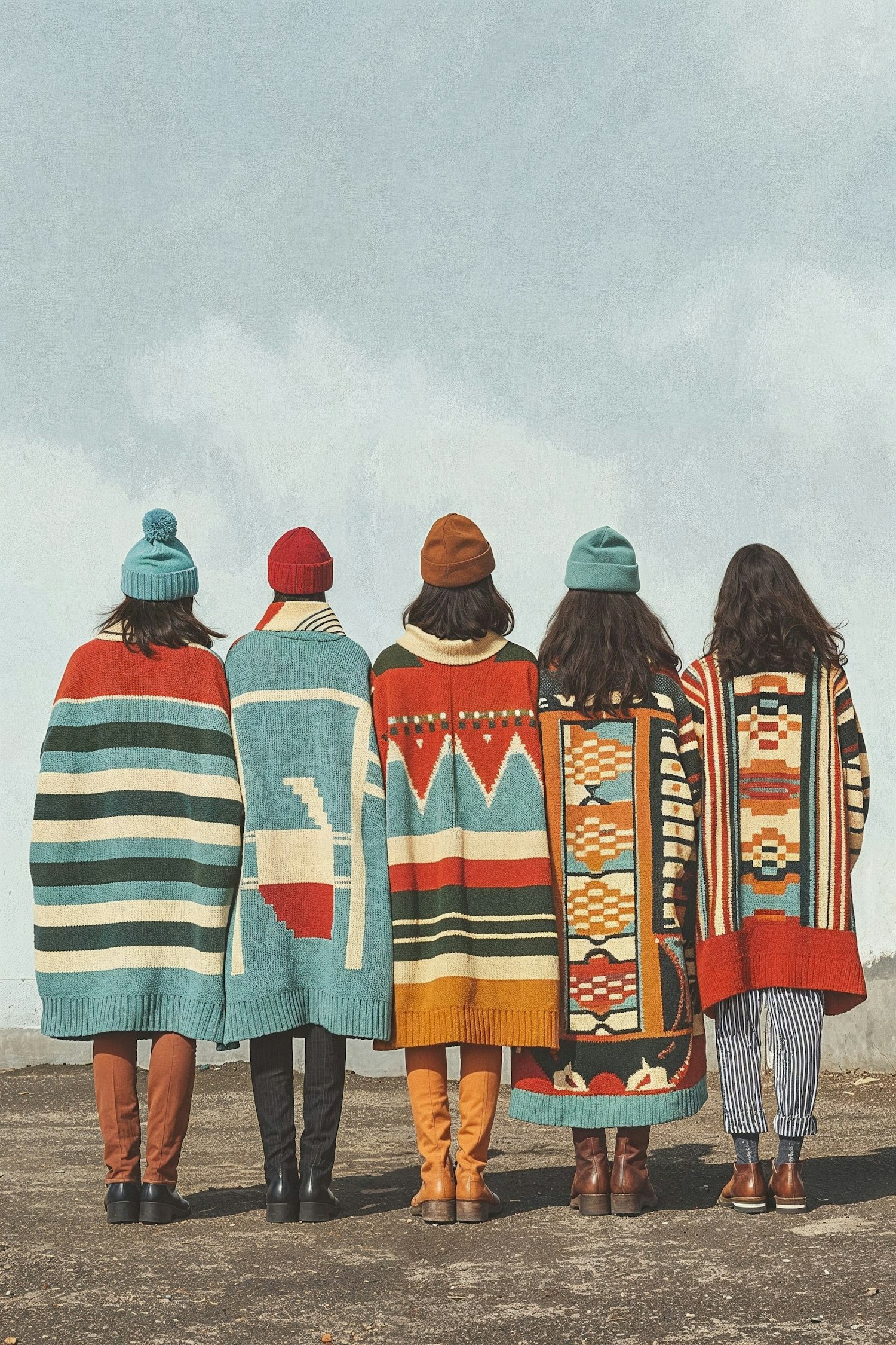 Five people in colorful ponchos and beanies stand against a light blue sky, showcasing vibrant geometric patterns.