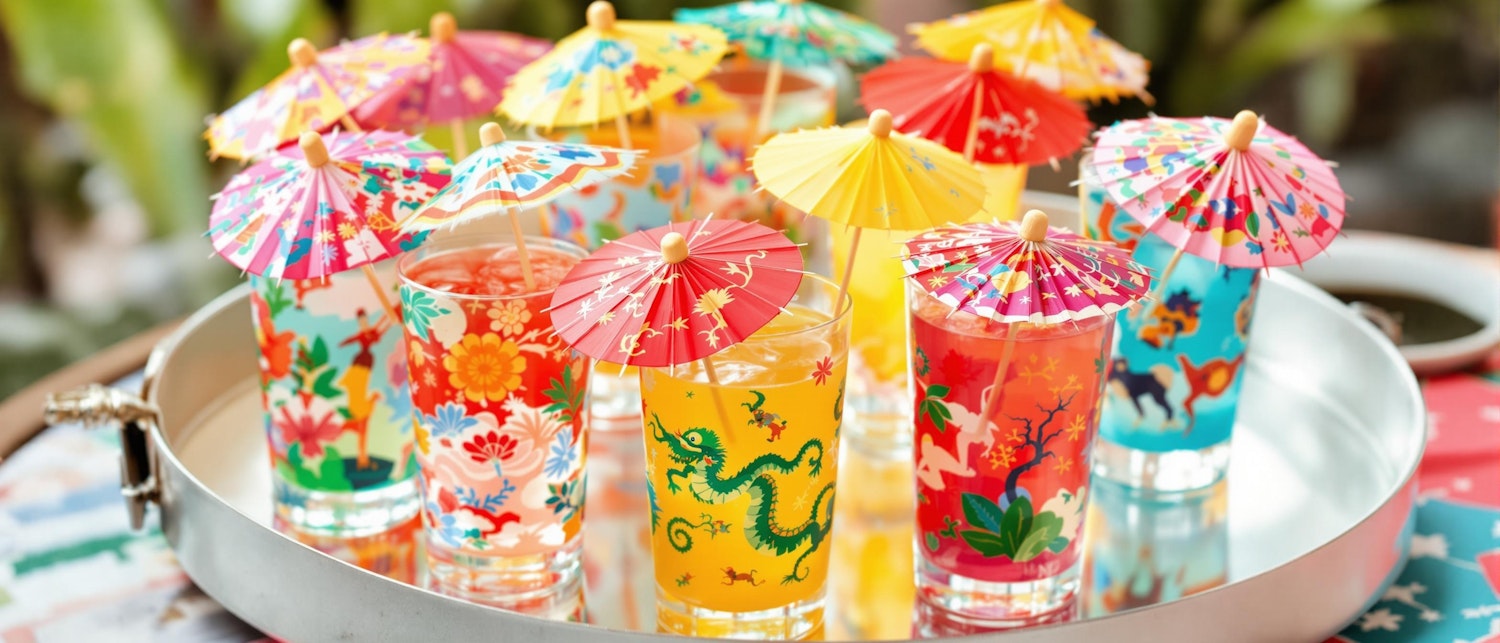 Brightly colored drinks with paper umbrellas on a silver tray, featuring playful designs of dragons and flowers. Perfect for summer vibes!