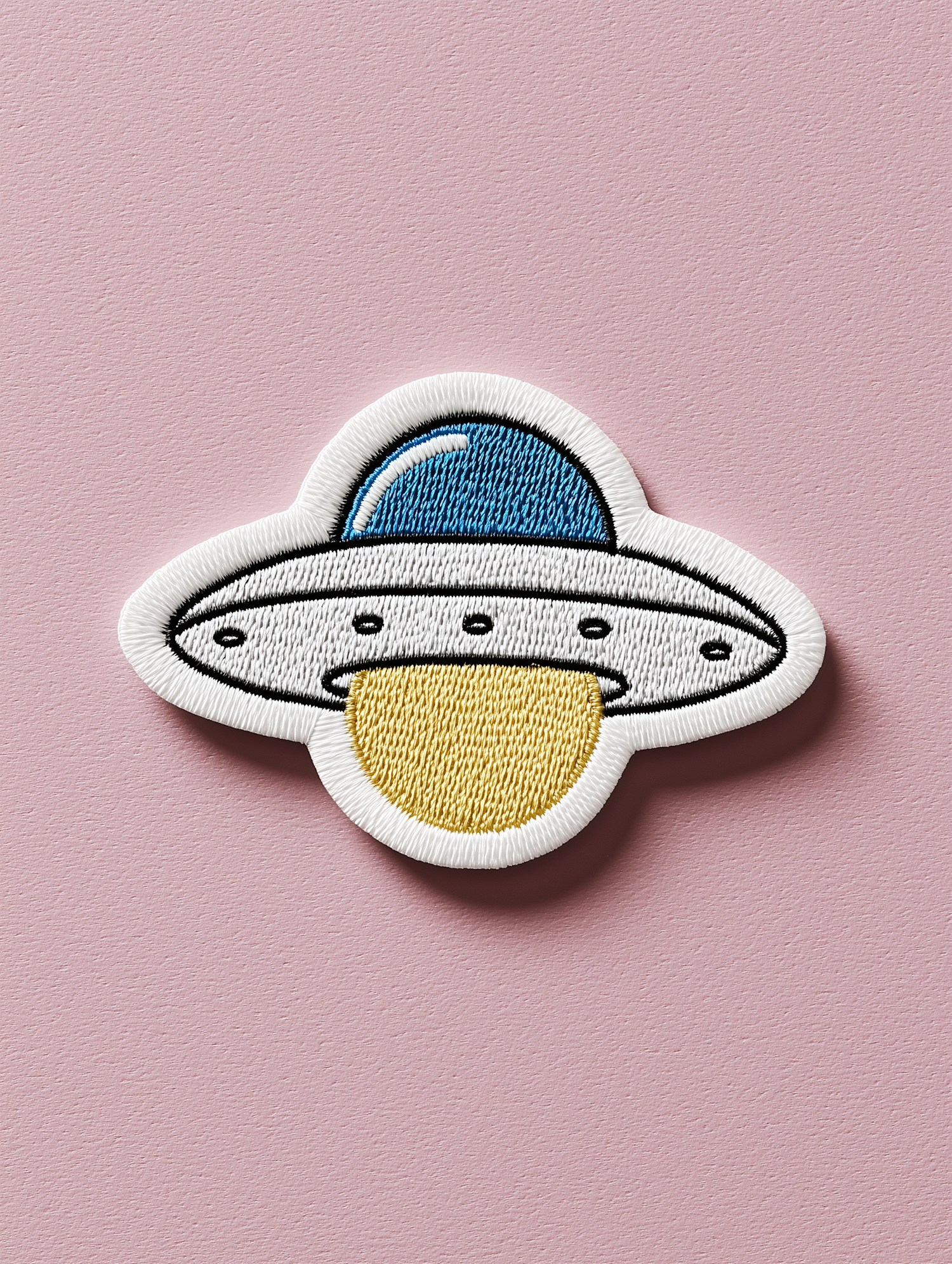 A vibrant embroidered UFO patch with a blue dome and yellow beam on a pastel pink background, showcasing intricate stitching details.