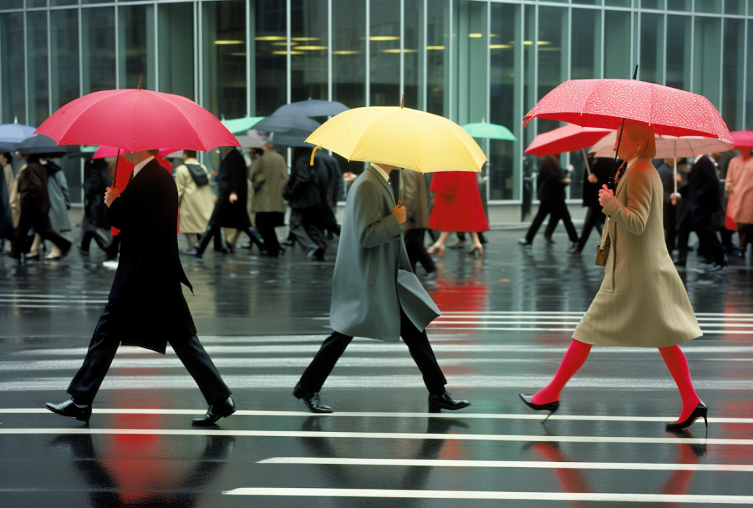 Vibrant city scene with people crossing a wet street, holding colorful umbrellas. Modern glass buildings in the background.