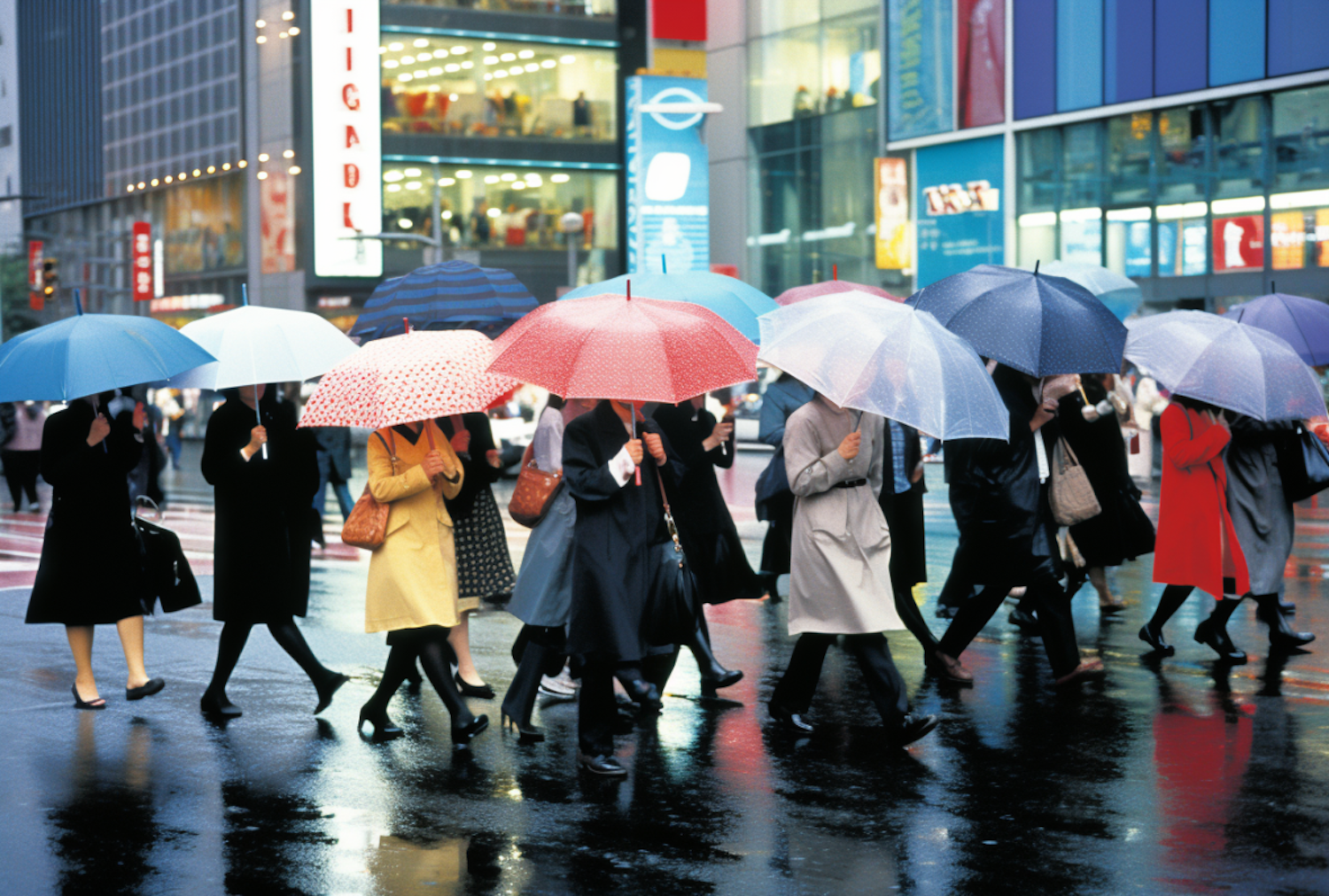 People with colorful umbrellas crossing a wet city street, reflecting vibrant urban life on a rainy day.
