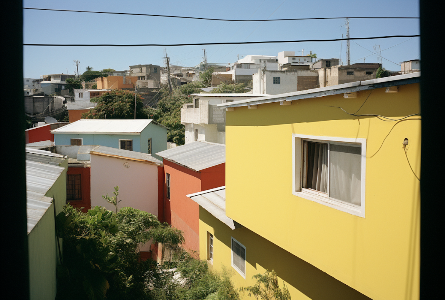 Colorful neighborhood with vibrant houses and lush greenery under a clear blue sky, showcasing urban life and community spirit.