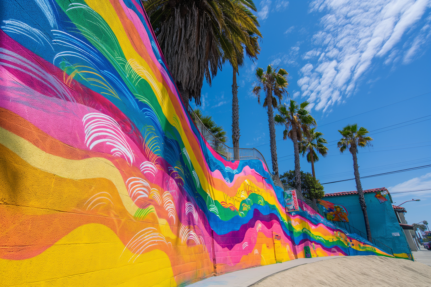 Colorful mural with wave patterns and palm trees under a bright blue sky, creating a vibrant and tropical urban scene.